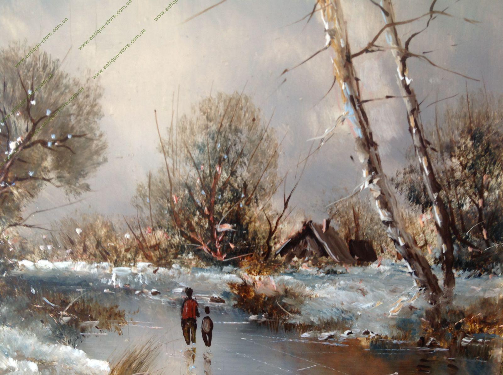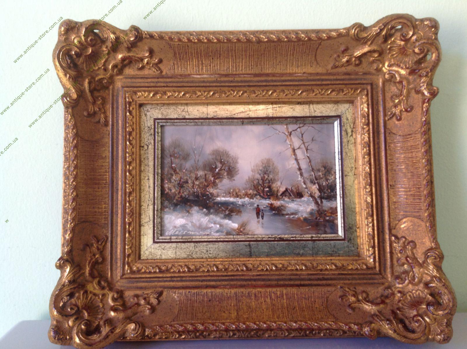 Зимний пейзаж в романтическом стиле. Размер без рамы: 21 х 27 см, с рамой: 32 х 37 см. Слева внизу подпись автора — Герхард Месмер (Gerhard Messmer)