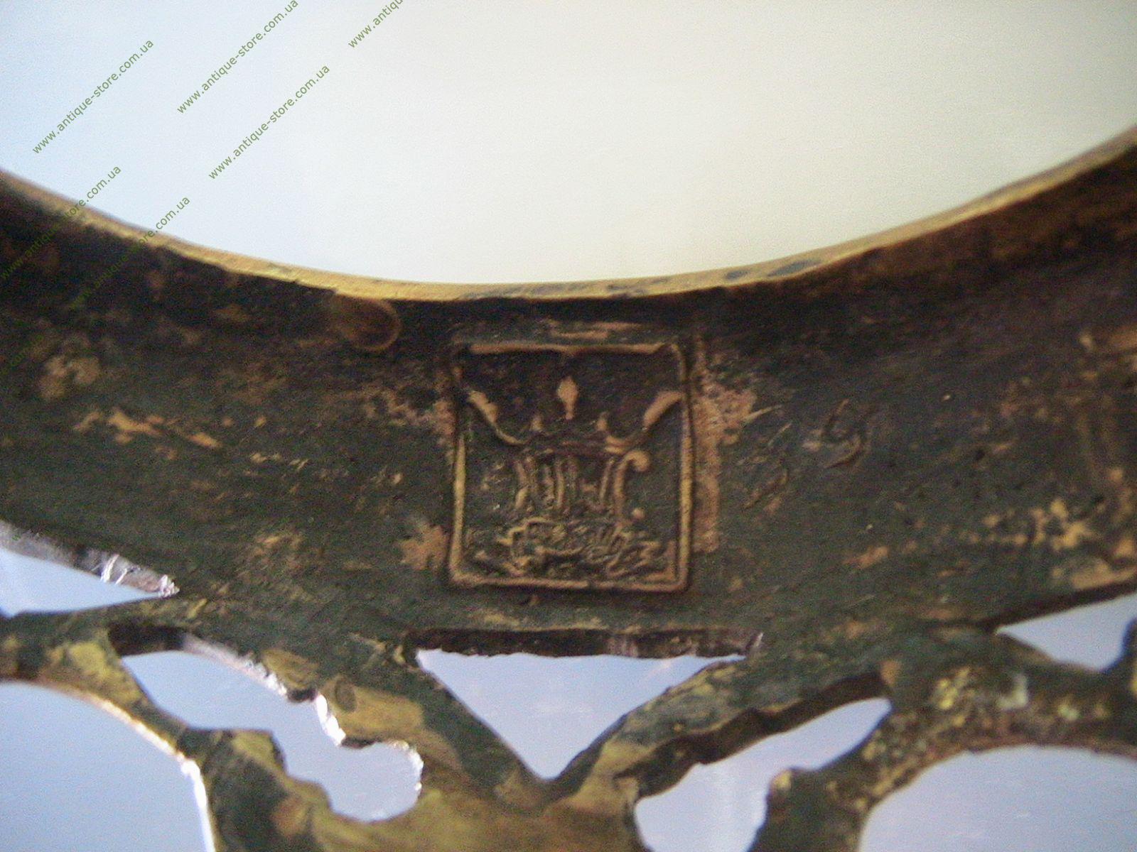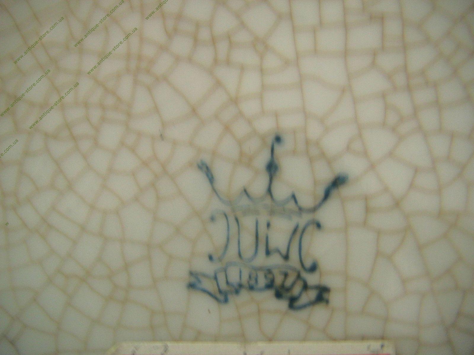 Старинная керамическая ваза Объединенных Уилсон 1987 с золочеными краями и двумя геральдическими гербами синего цвета. На вазе клеймо синего цвета “ JUWC 1897 “. Аналогичное клеймо на бронзовой подставке с фигурными ножками, на которой расположена Ваза. Великолепная ваза!