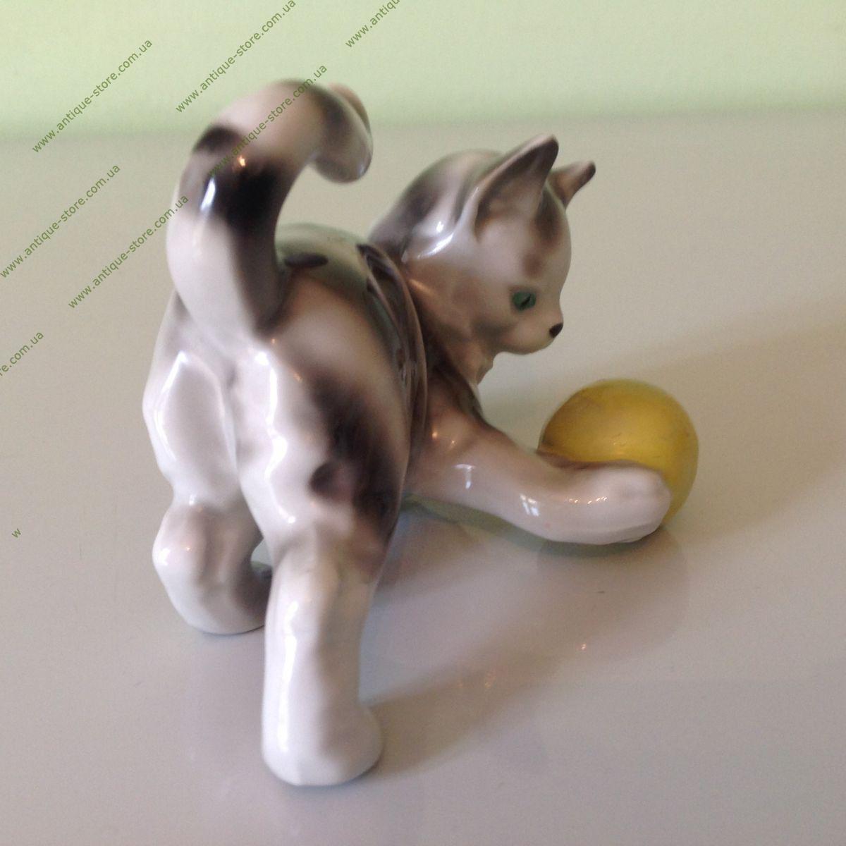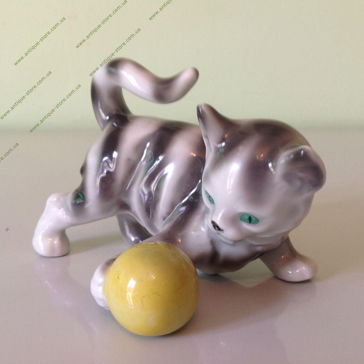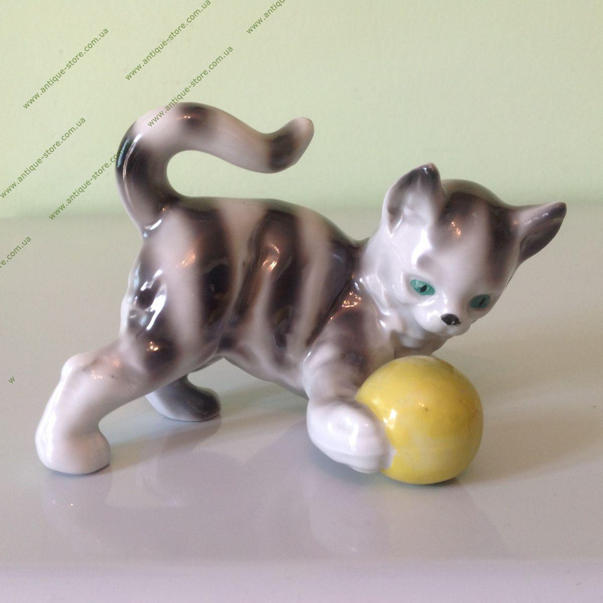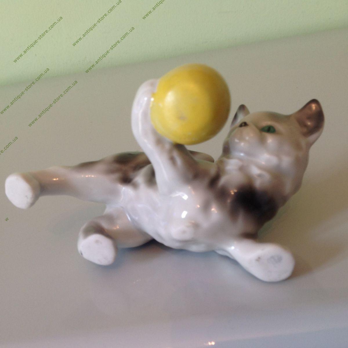 Фарфоровая статуэтка полосатого котенка, играющего с мячом - фигурка производства Германии, предположительно "Графенталь"(Grafenthal Porzellan), клеймо читается неразборчиво.