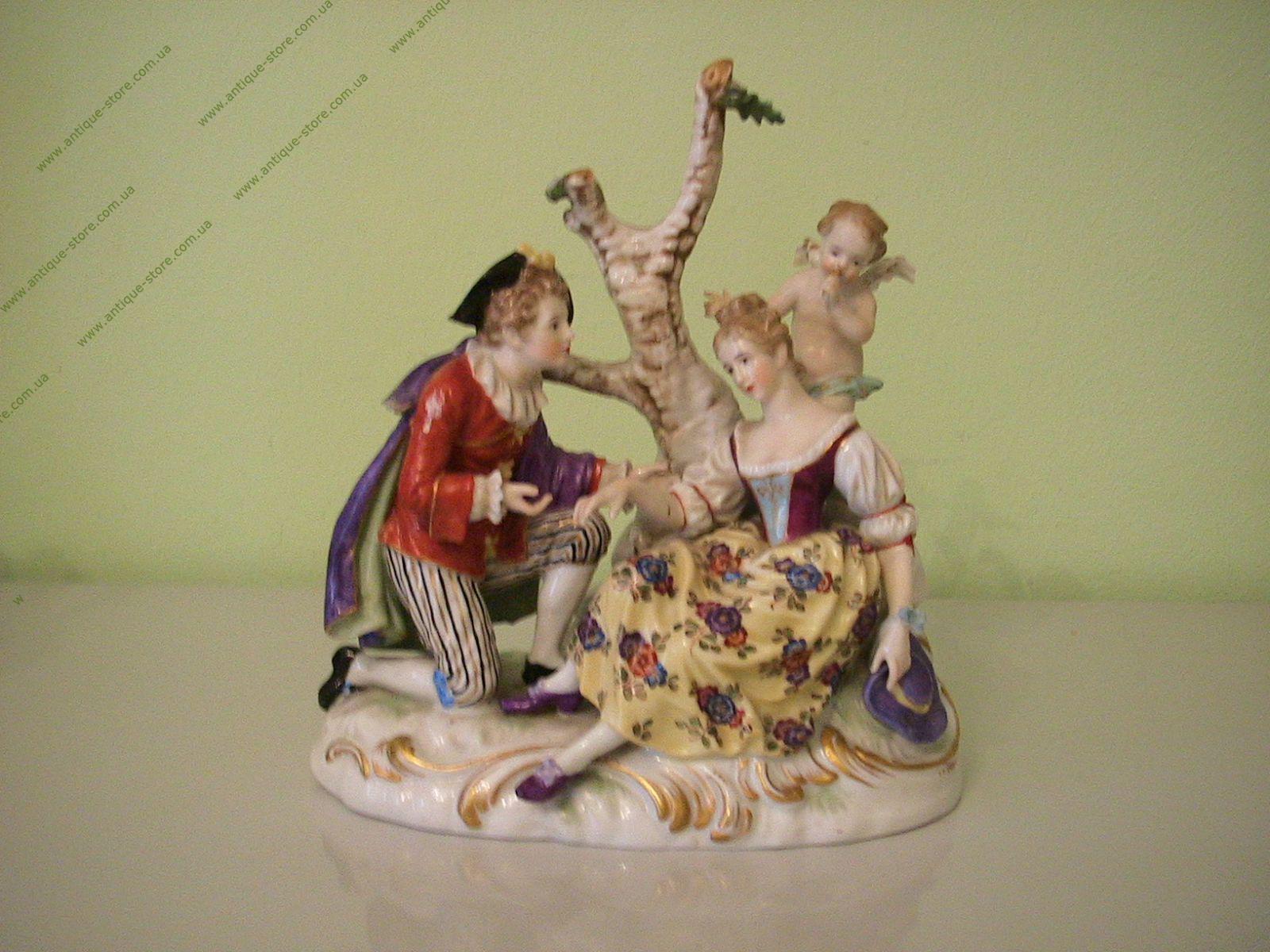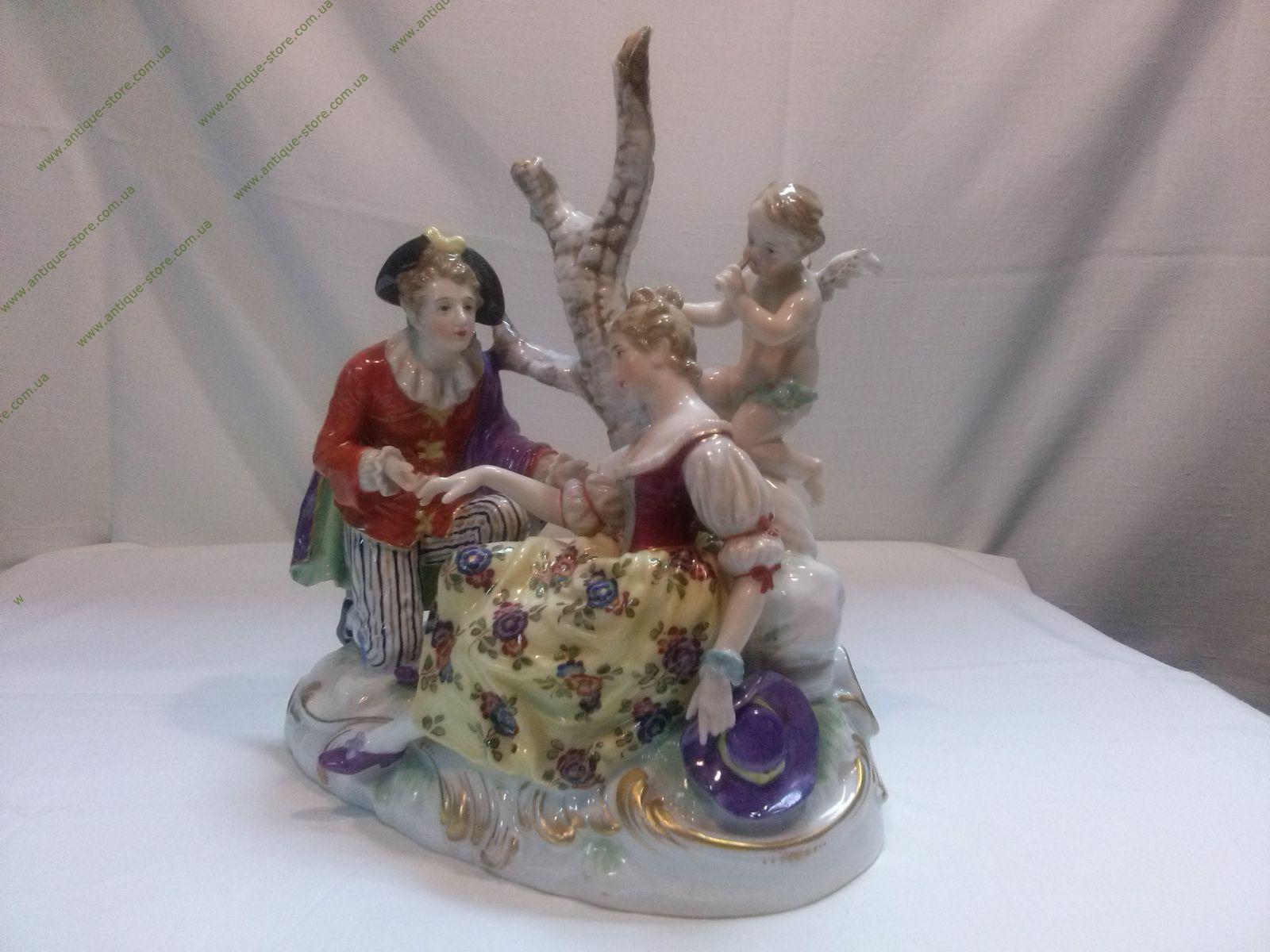 Фарфоровая композиция, изображающая любовное свидание: кавалера и даму, сидящих под деревом любви, и амура, подглядывающего за ними. Фигурка знаменитой фарфоровой мануфактуры Дрессель Кистер & Co (Dressel Kister &Co), Пассау, Бавария, Германия. Есть номер 8834, подглазурное и выдавленное клеймо.