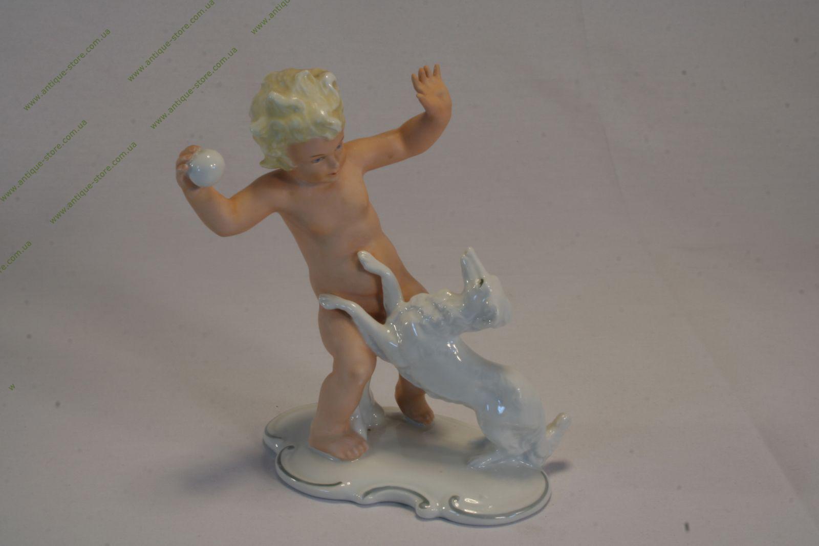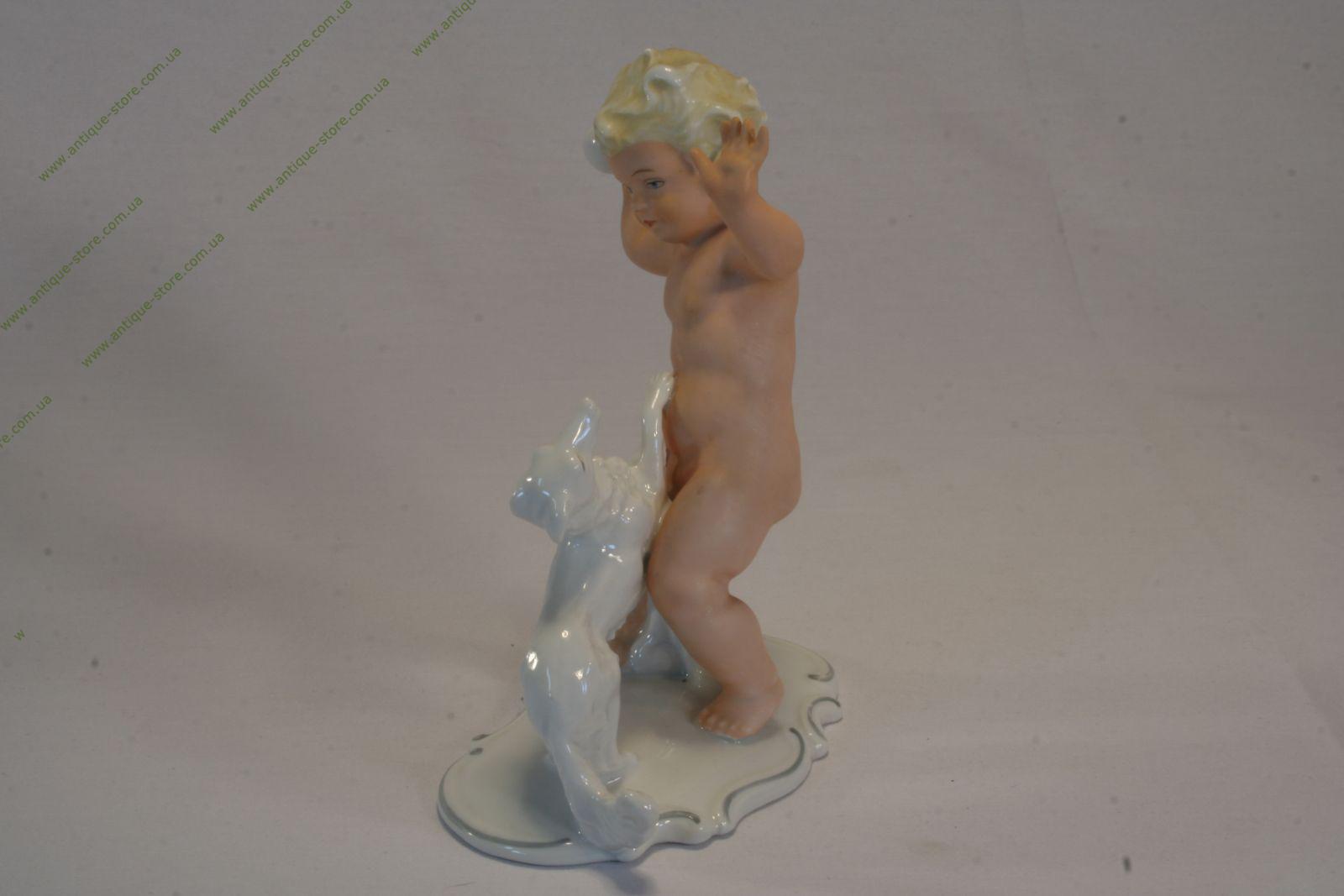 Фигурка путти (обнаженного малыша), играющего с собакой, исполнена из двух видов фарфора: глазурованного и бисквитного. Валендоррф, Германия.