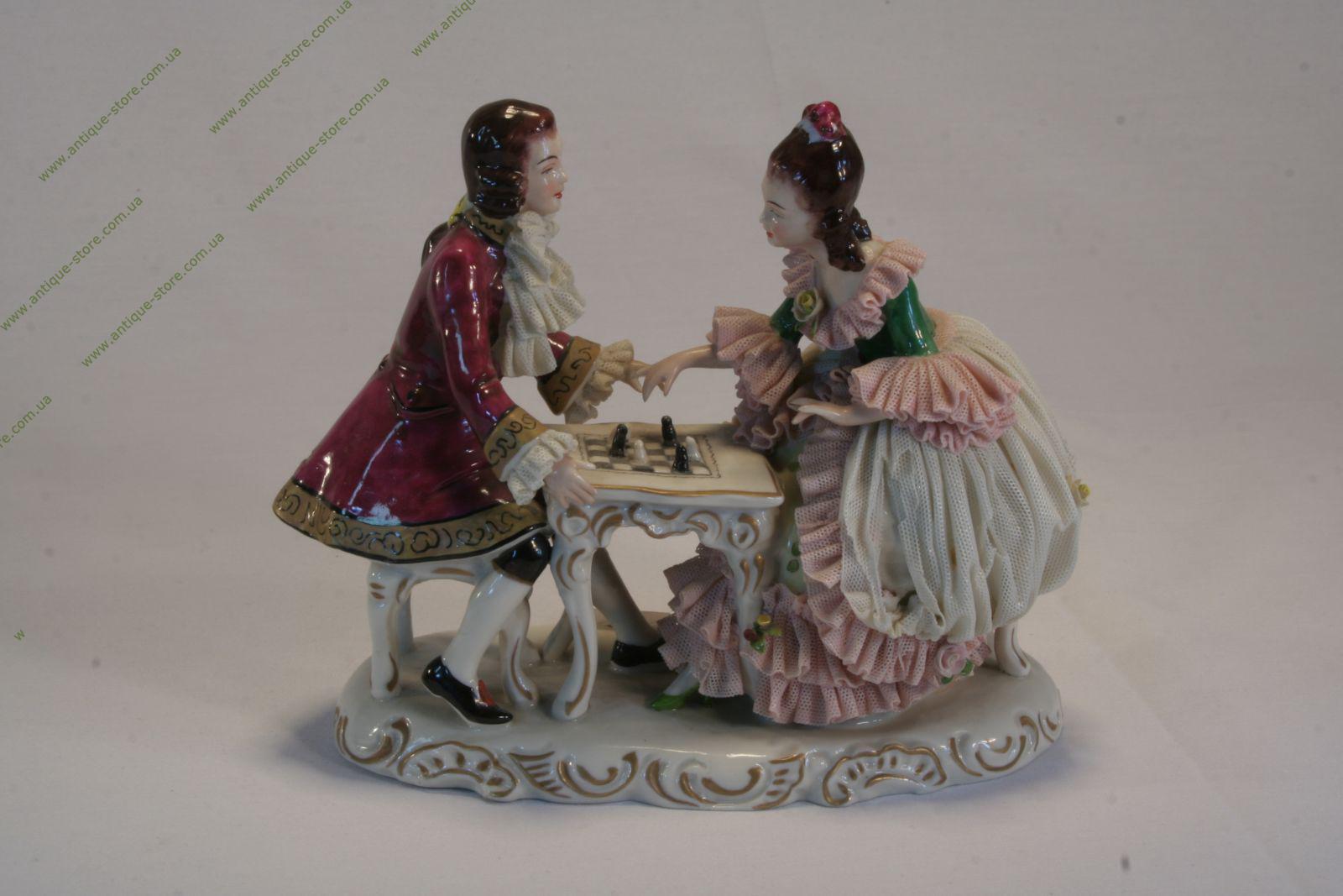 Фарфоровая фигура, изображающая галантную пару - кавалера и даму, играющих в шахматы Производство знаменитой немецкой фарфоровой мануфактуры Альтесте Фольксштедт (Aelteste Volkstedt).