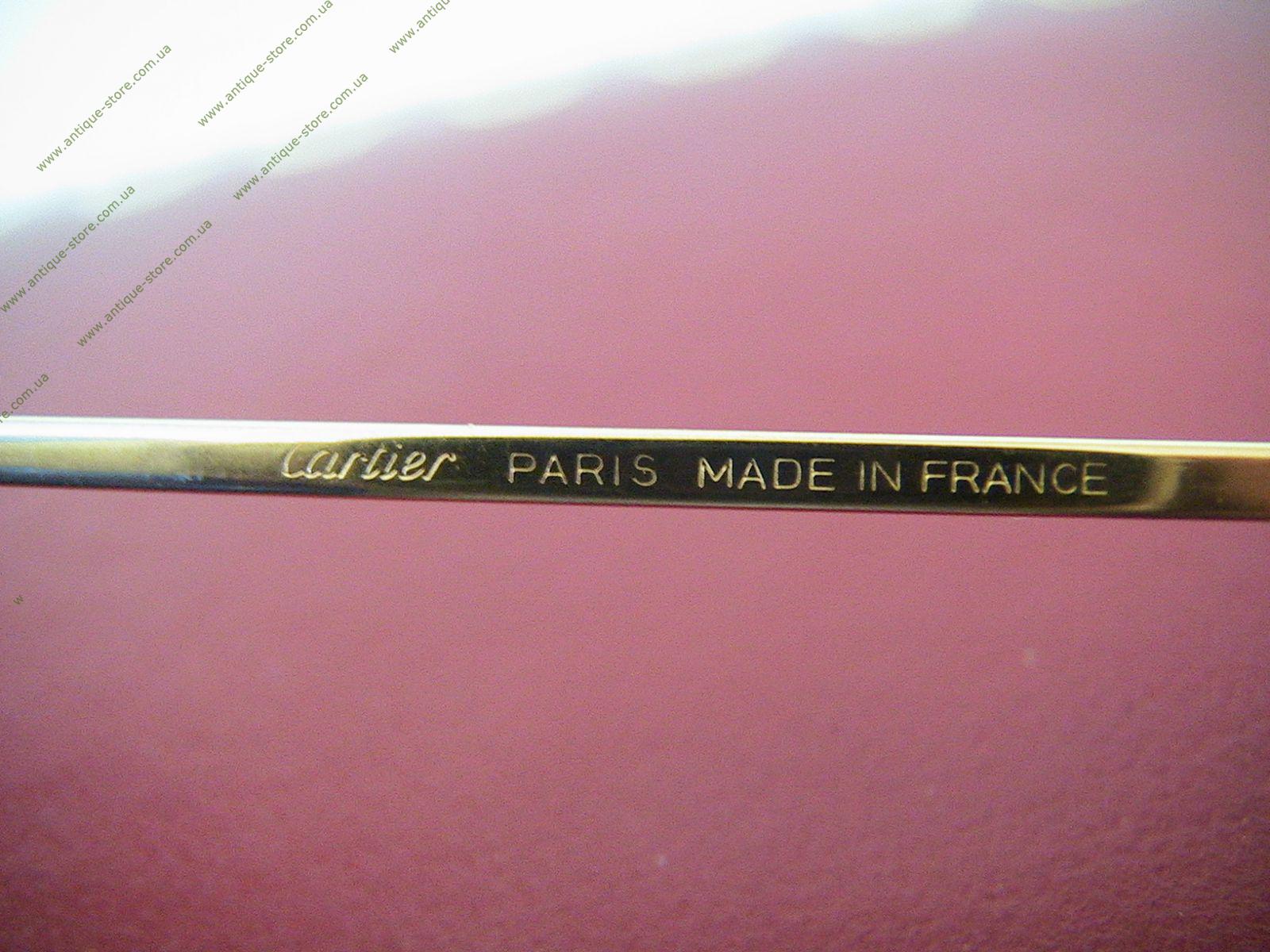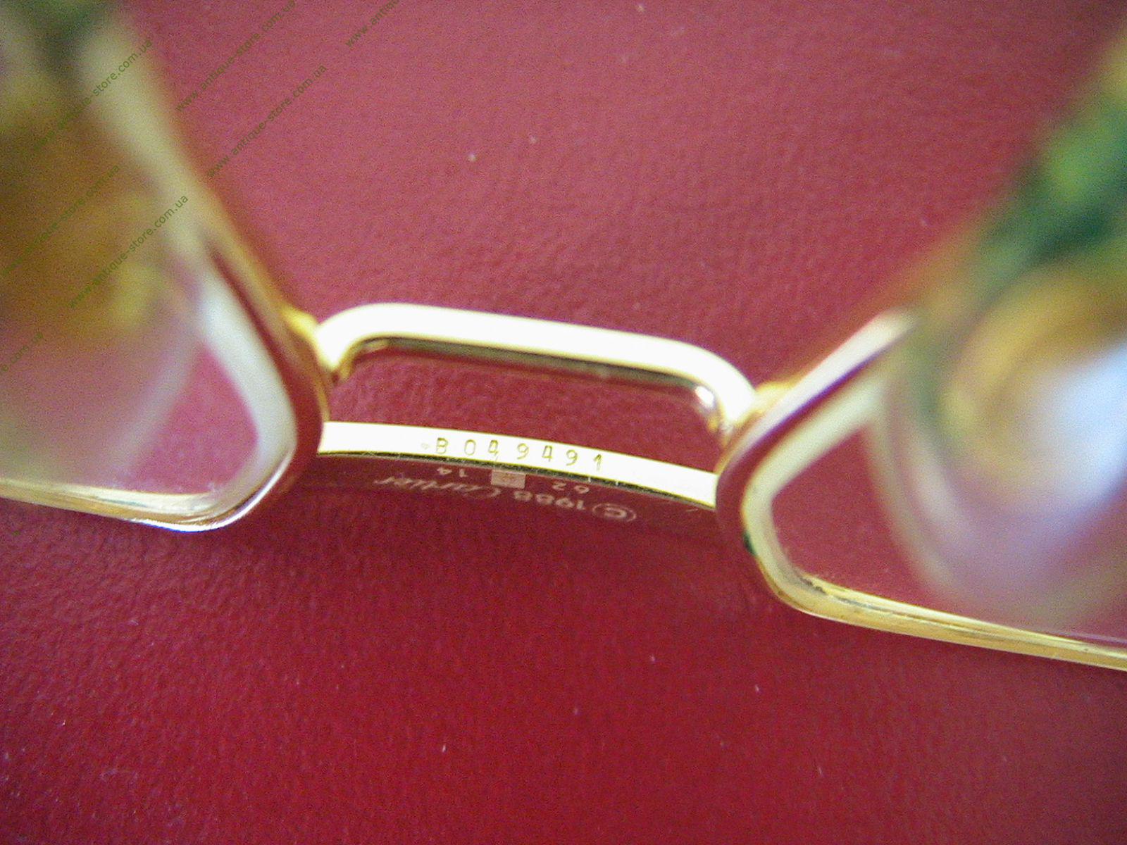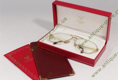 Очки «Cartier», модель номер 234876, Франция, позолоченные 14 кар. (585°). Дужки из ацетатного материала, с подписью Cartier, оптические стекла, оригинальная коробка и кожаный чехол. Документы прилагаются. Небольшие следы использования, ширина ок. 13см.