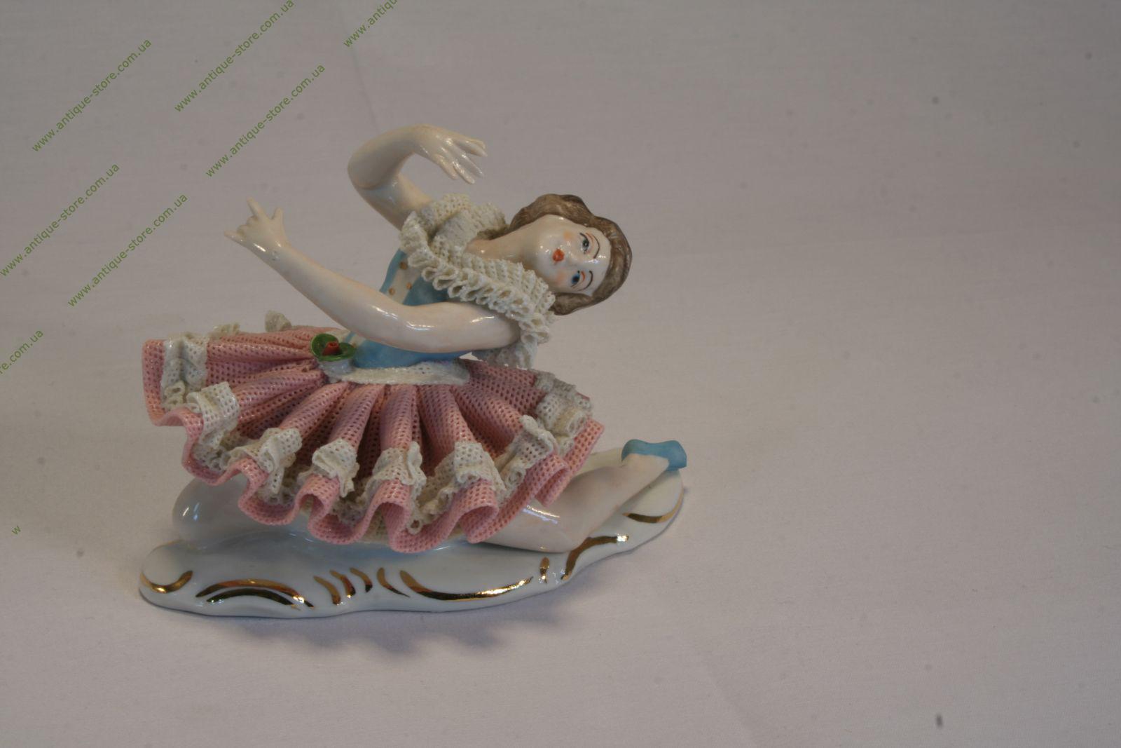 Коллекционная фарфоровая статуэтка "Девочка - балеринка на колене", изображающая балеринку в бело-розово-голубом платье, стоящую на одном колене, изготовлена из знаменитого дрезденского фарфора.