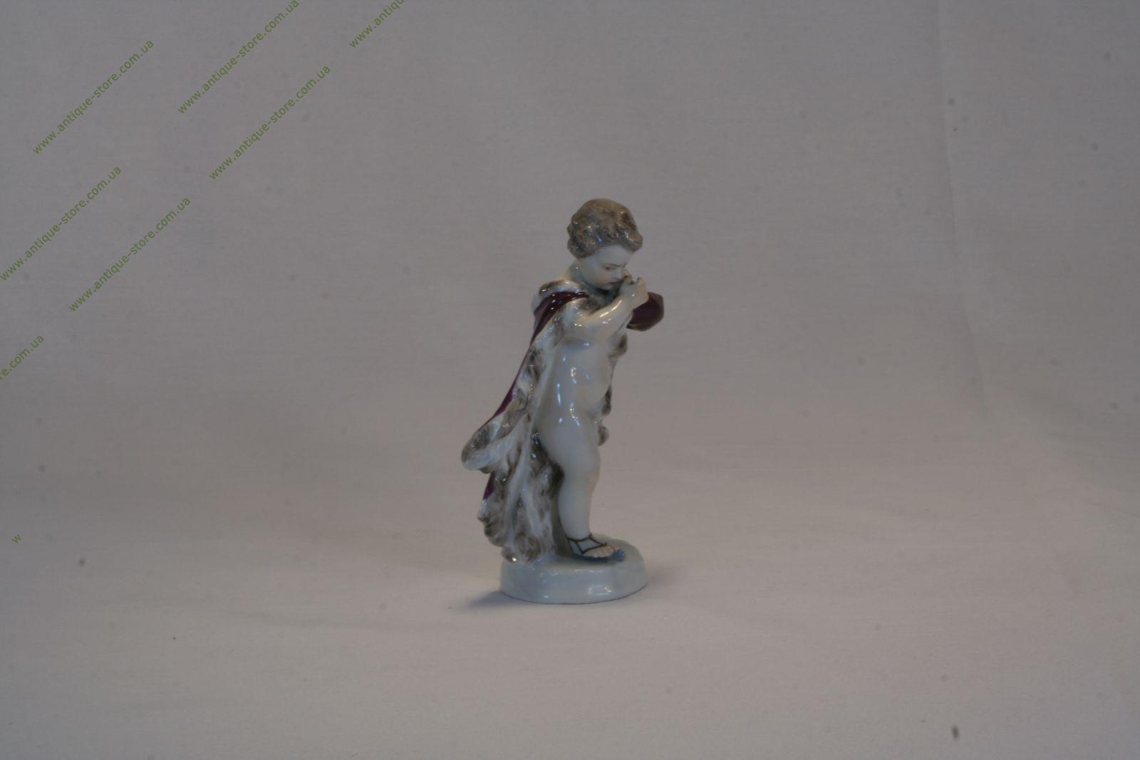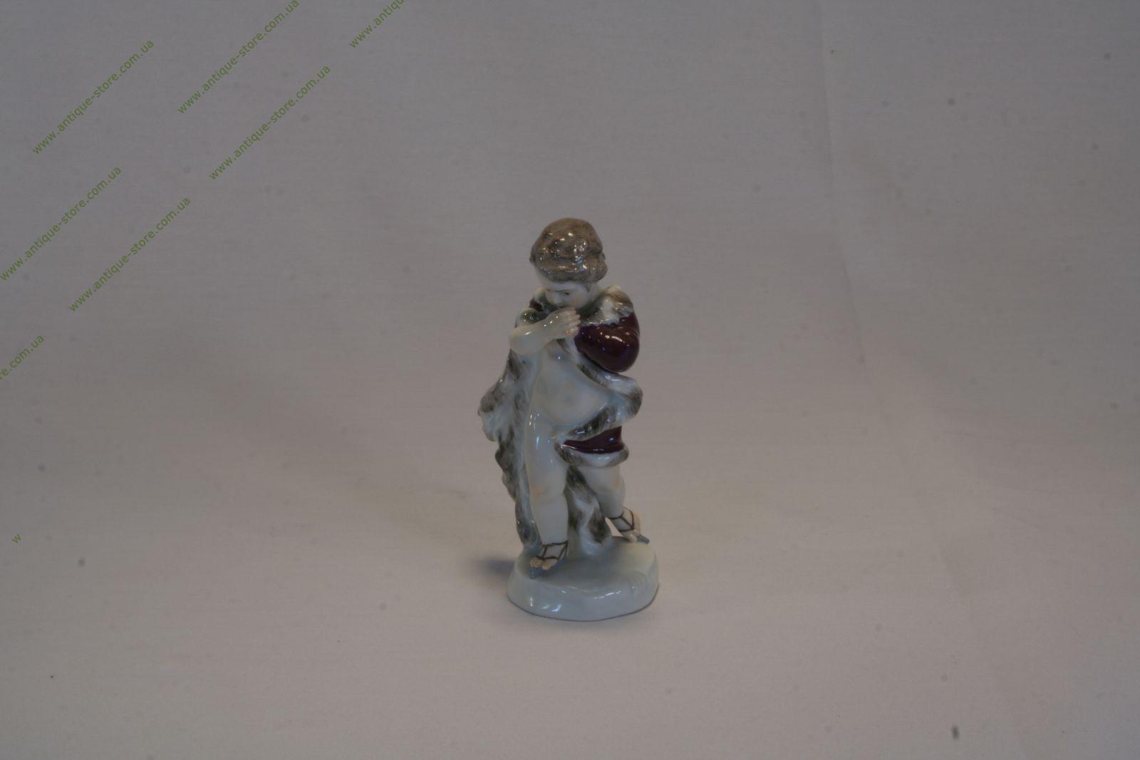 Великолепный мейсоновский фарфор. Аллегория зимы. Коллекционная фарфоровая фигура, изображающая аллегорию зимы в виде путти (малыша) на коньках, закутавшегося в плащ. Работа знаменитого художника мануфактуры Мейсен (Meissen), Иоанна Иоахима Кэндлера (Joann Joachim Kaendler 1706-1775).