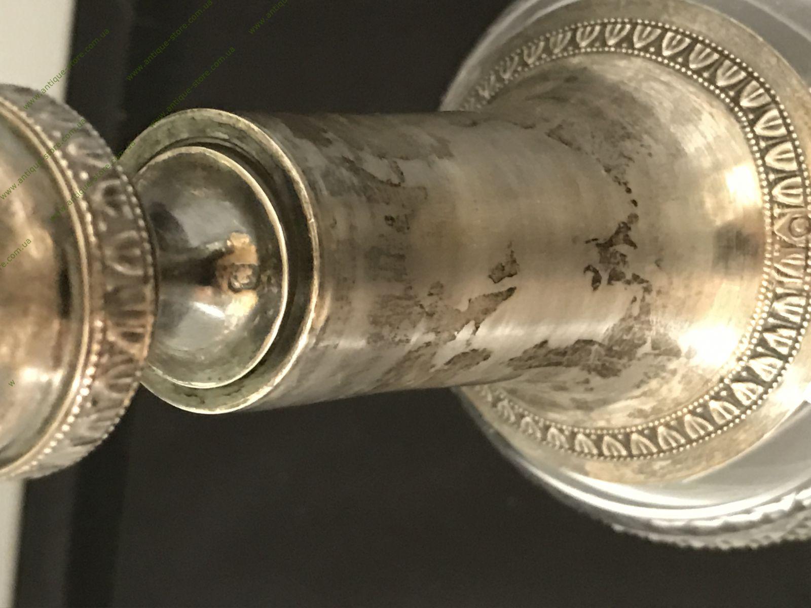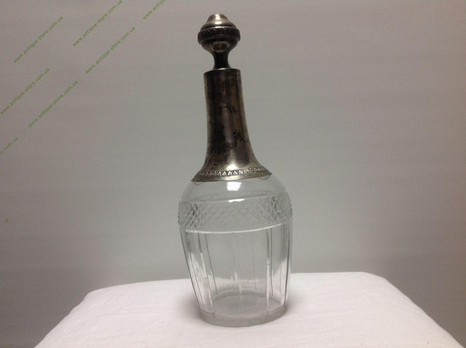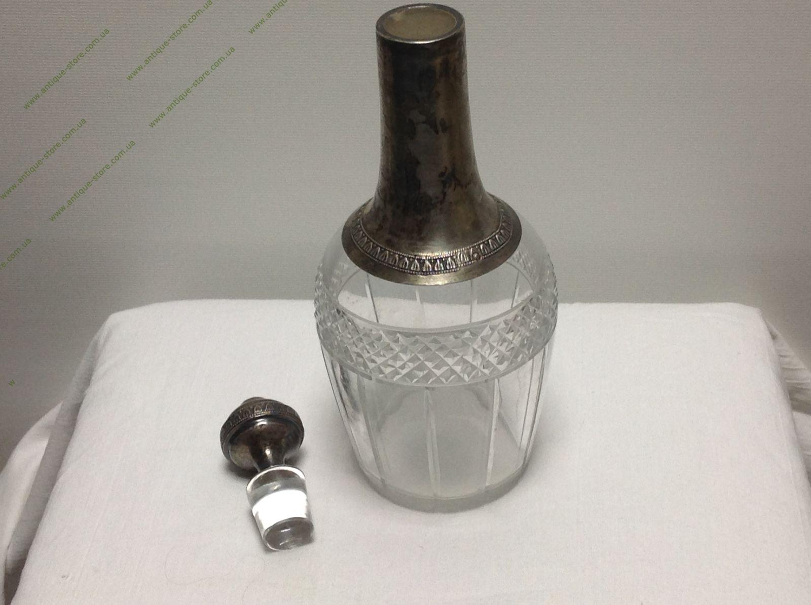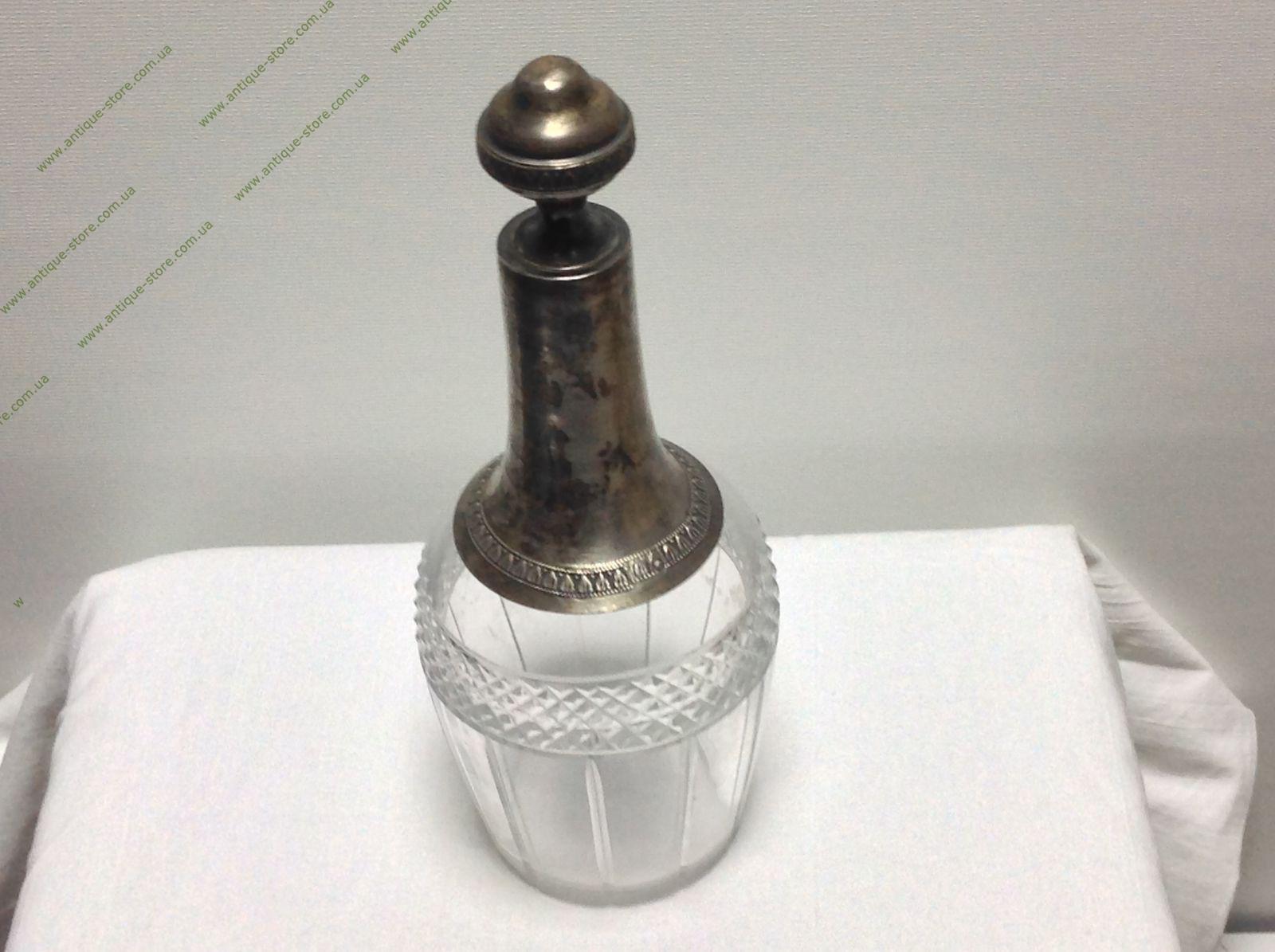 Графин из хрусталя, тонкой работы с серебряным горлышком (800°), и серебряной пробкой , с клеймом в виде головки (Австрия, нач. 20-го века) . Объем 300 мл. Идеально подходит для водки.