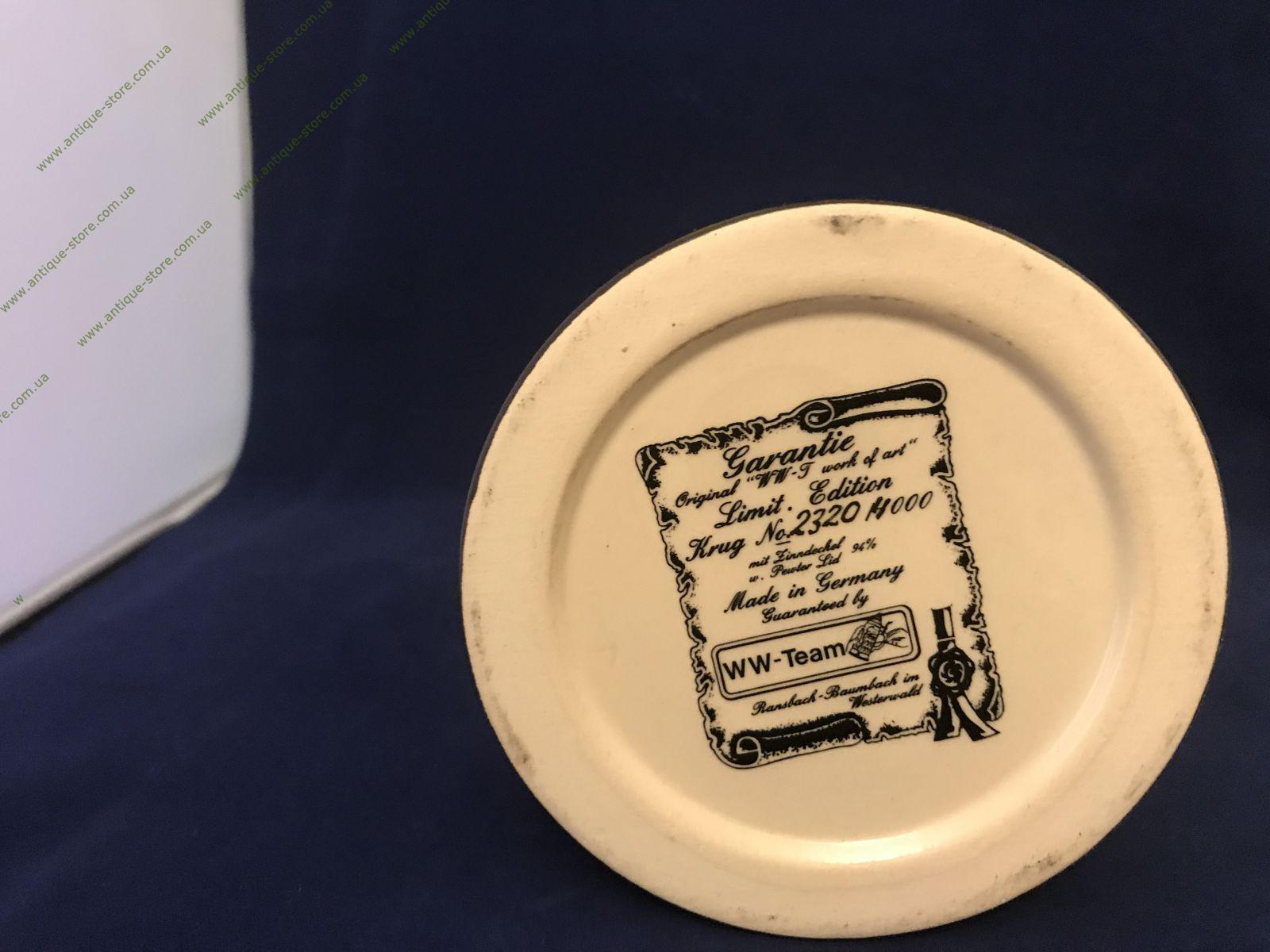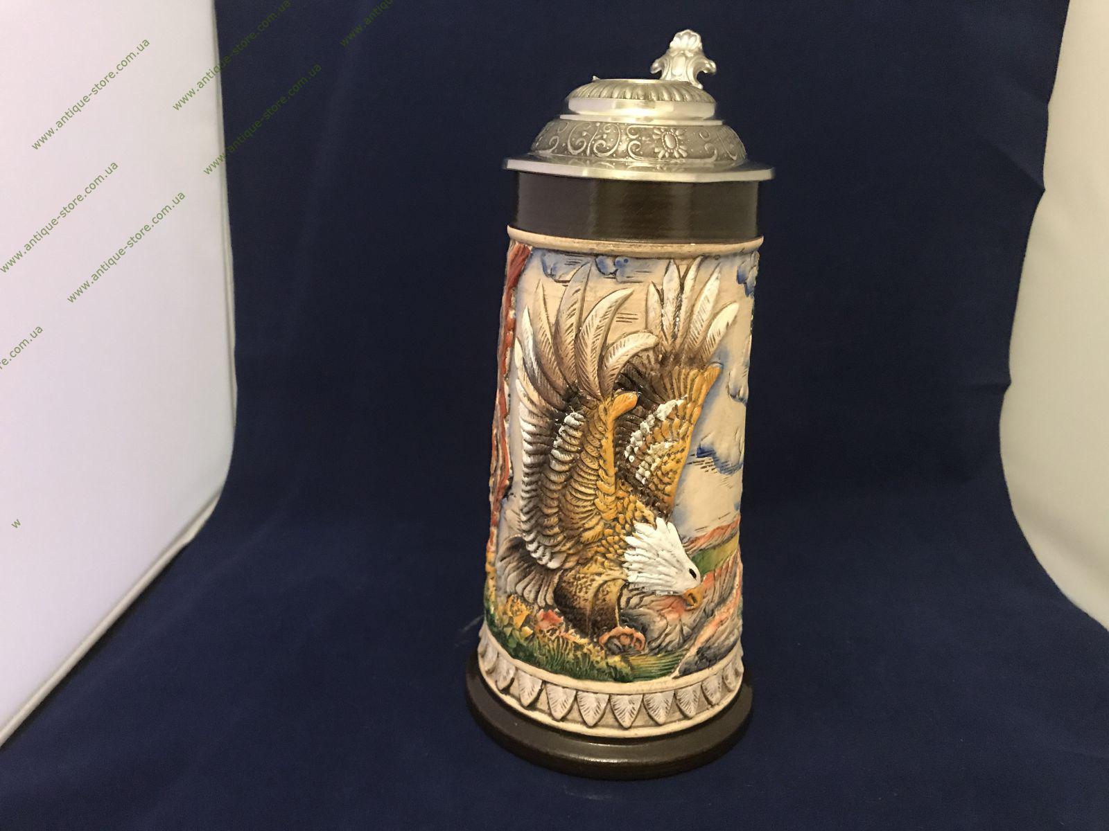 Немецкая пивная кружка украшенная рельефным украшением в виде орла. Художественный рельеф расписан полихромной росписью и покрыт глазурью; на дне кружки печать изготовителя; кружку венчает классическая крышка . Прекрасный подарок любителю пенного напитка и отличный предмет в коллекцию!