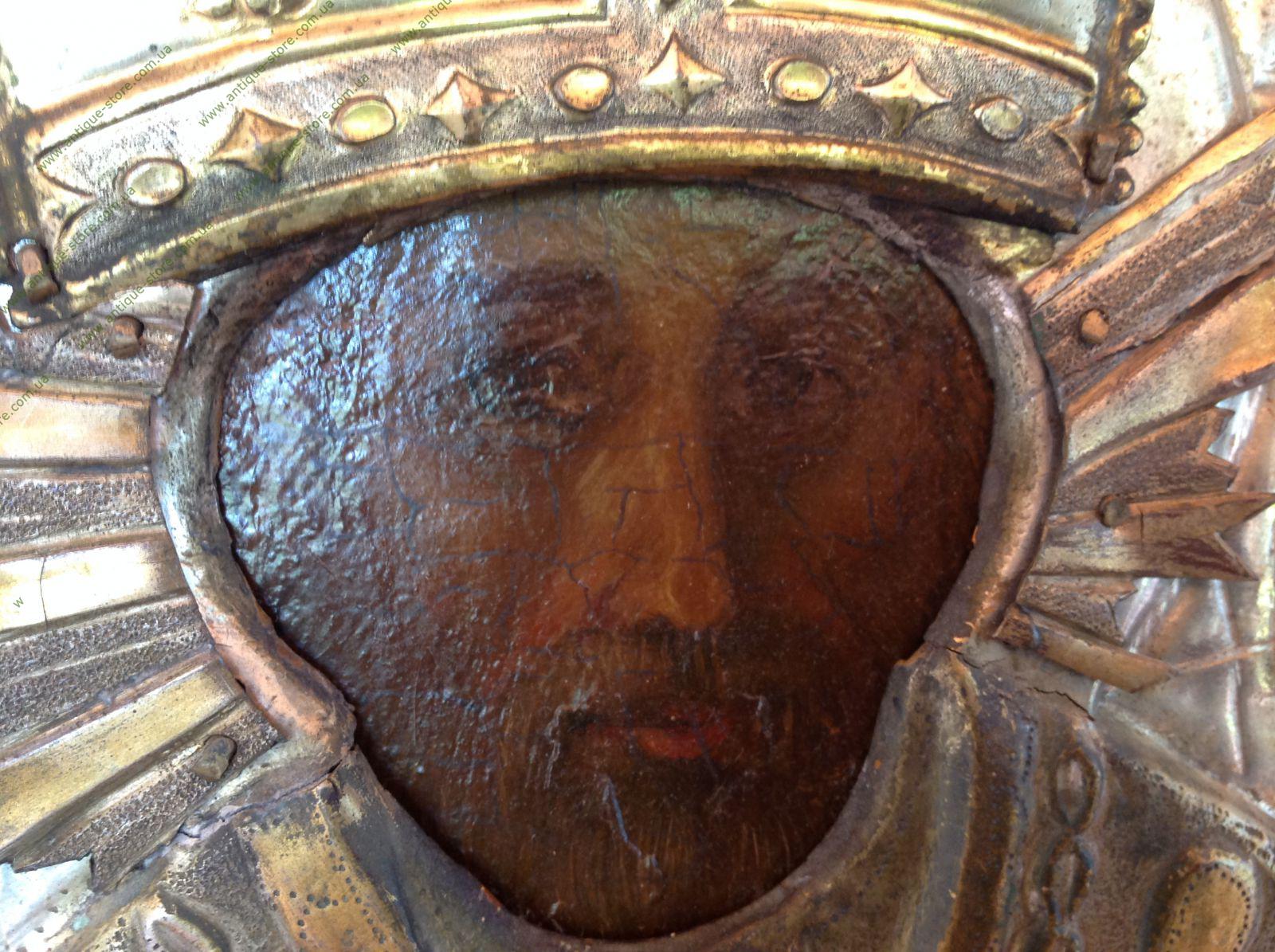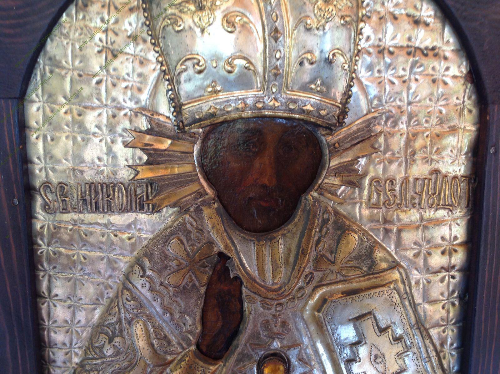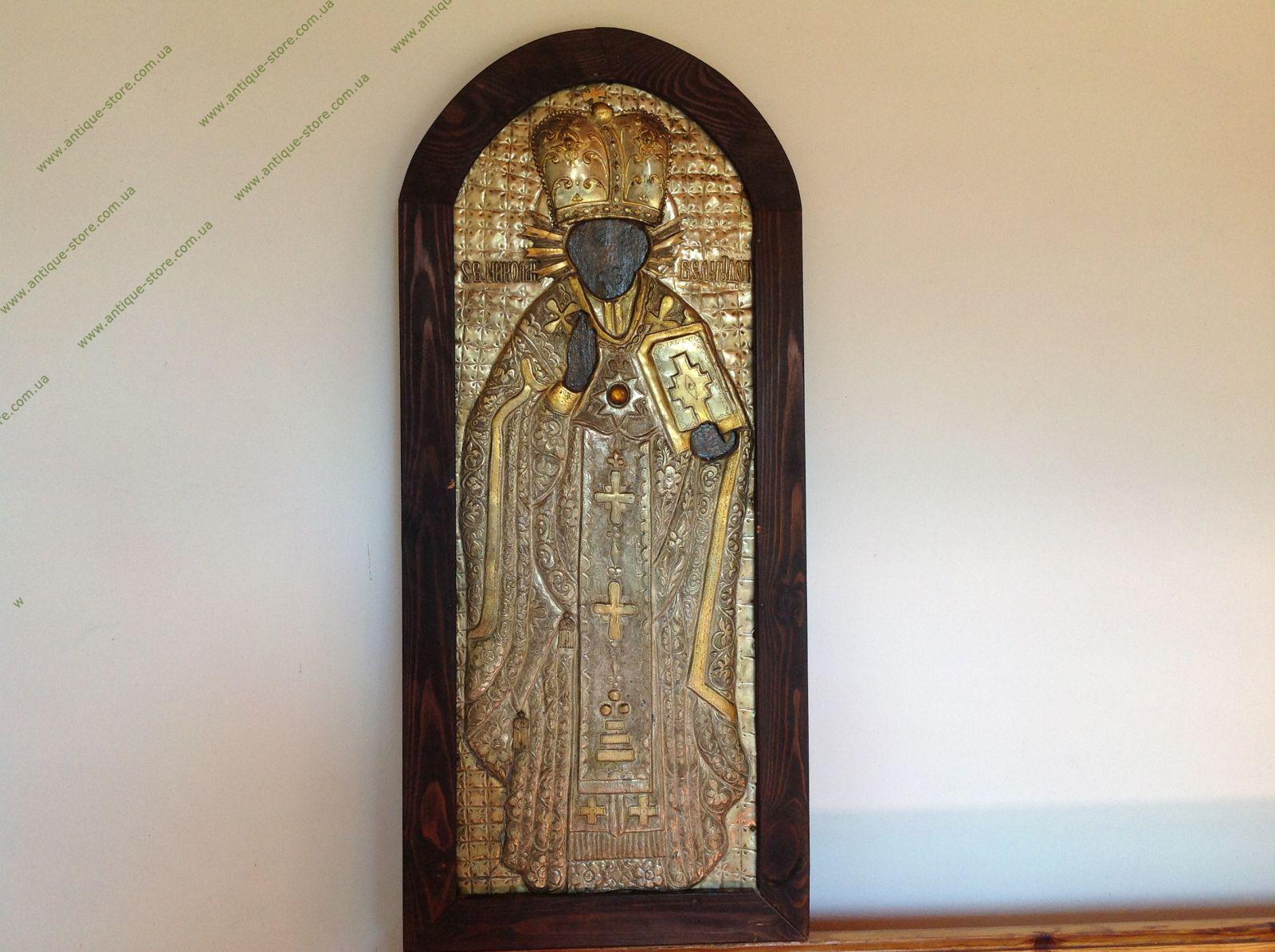 Икона "Святой Николай Чудотворец" в окладе. Николай Зимний. Дерево, масло, латунь, чеканка. Без оклада 30 х 80 см.,с окладом 40 х 90 см. Российская Империя,середина 19-го века. Оклад: латунь с серебрением и позолотой.
