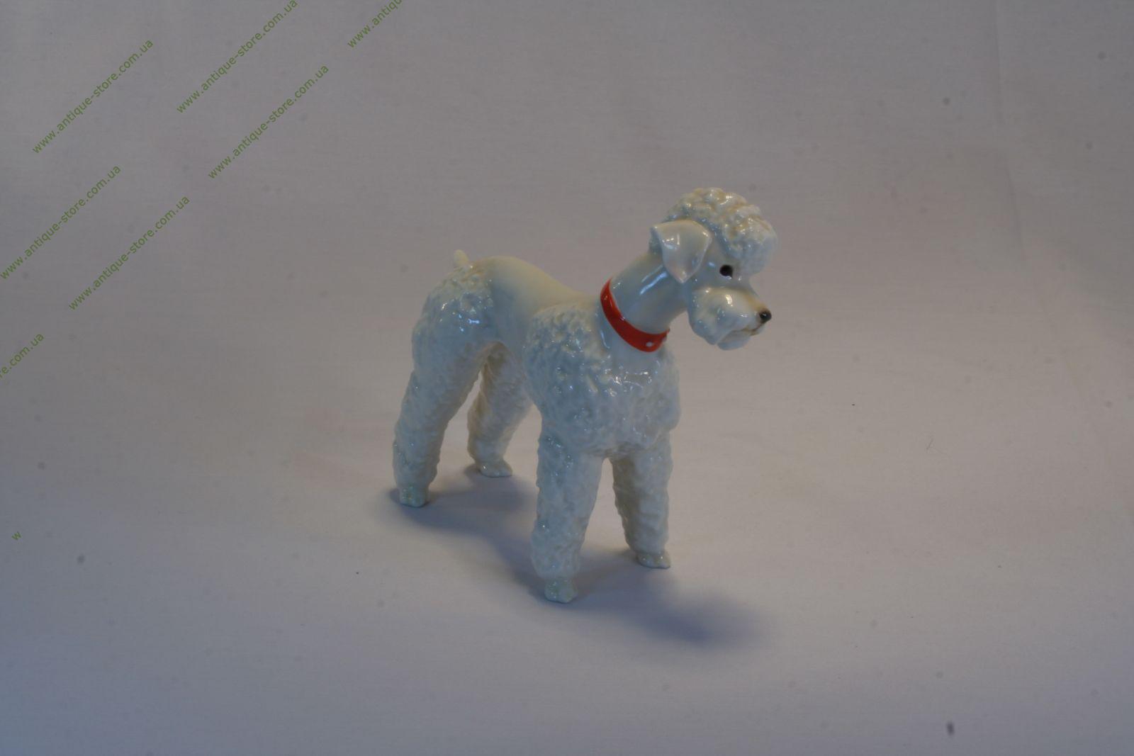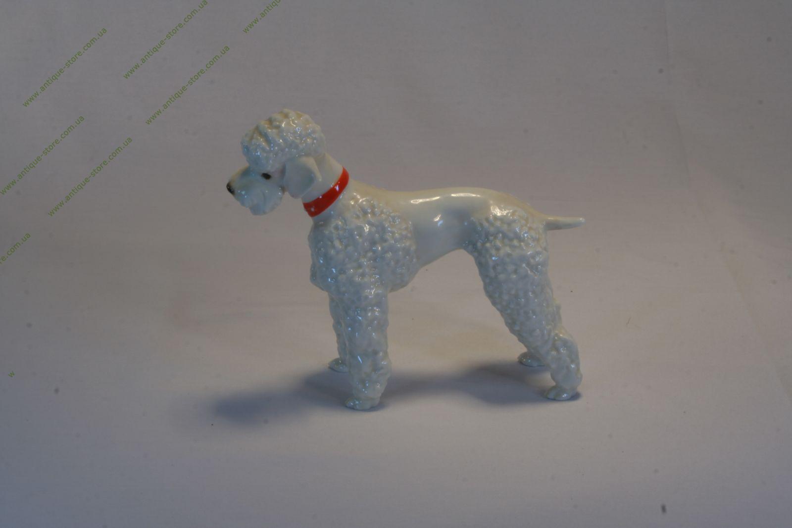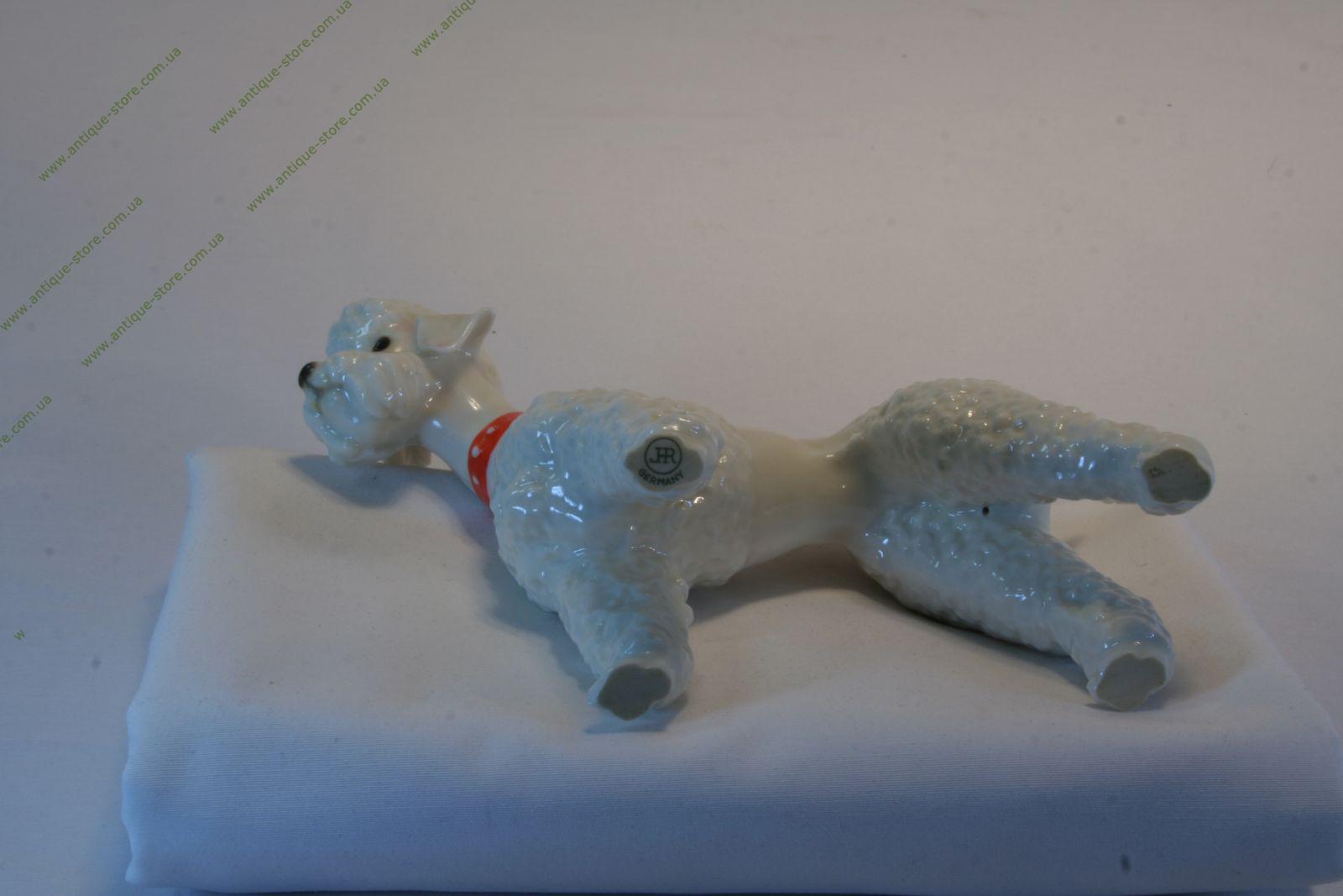 Фигурка, изображающая белого королевского пуделя с красным ошейником, с клеймом на обратной стороне. Работа знаменитого художника Х. Ахцигера (H. Achtziger). Производство крупнейшего немецкого концерна Hutschenreuther (Хутченройтер), основанного в 1814 году в Баварии художником Карлом Магнусом Хутченройтером.