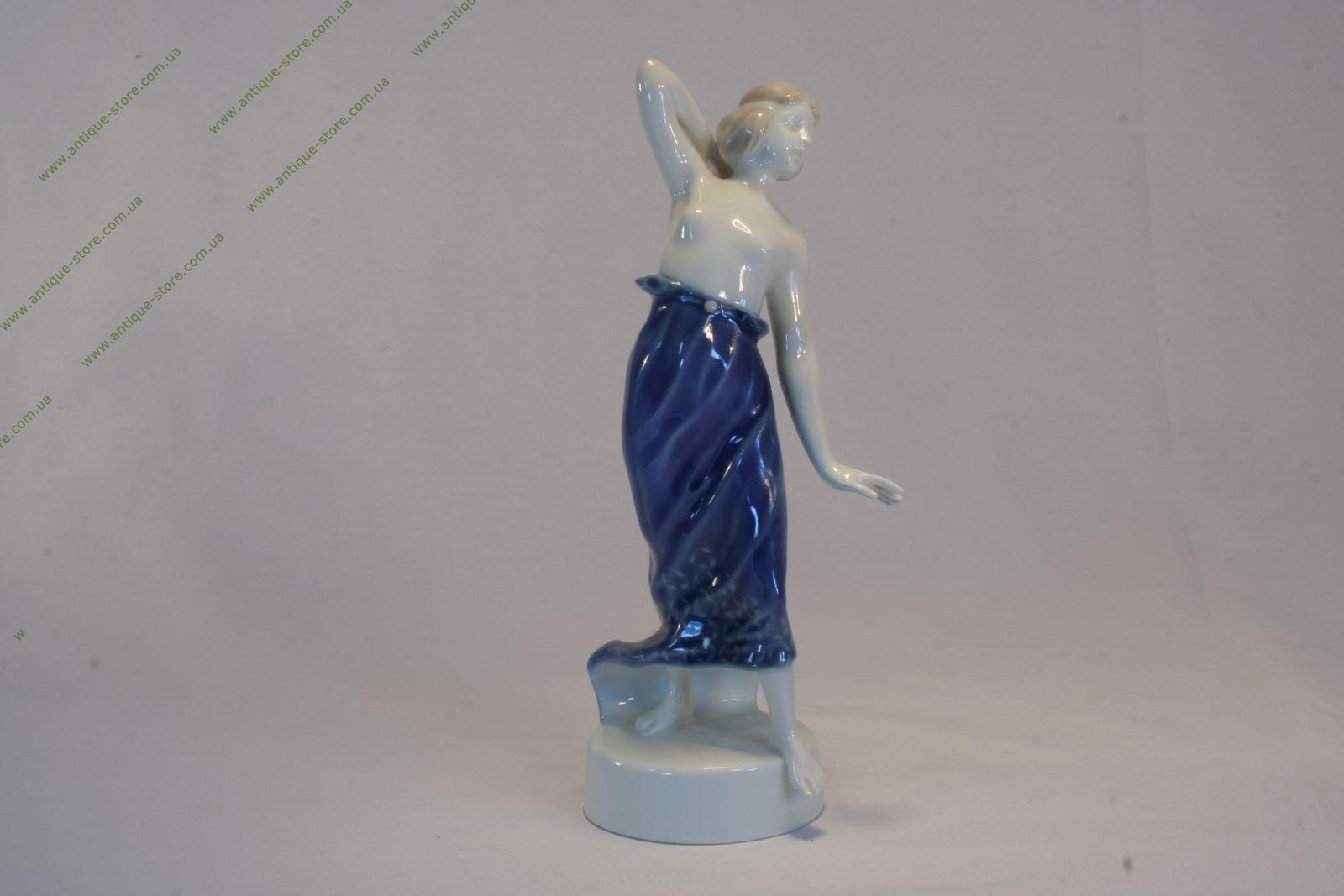 Великолепный розенталевский фарфор. Коллекционная фарфоровая статуэтка танцовщицы, исполнителняющую ионический танец. Танцовщица обнажена до пояса, в синей юбке. Работа знаменитого художника фабрики Розенталь (Rosenthal) Берхольда Бёсса (Berthold Boess), модель 1913 г.