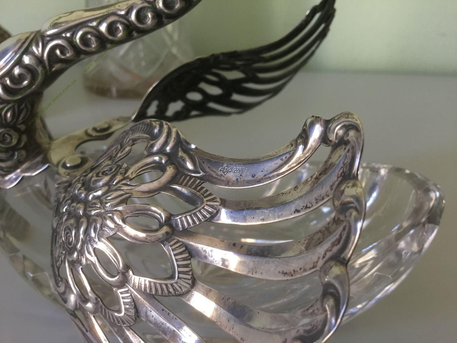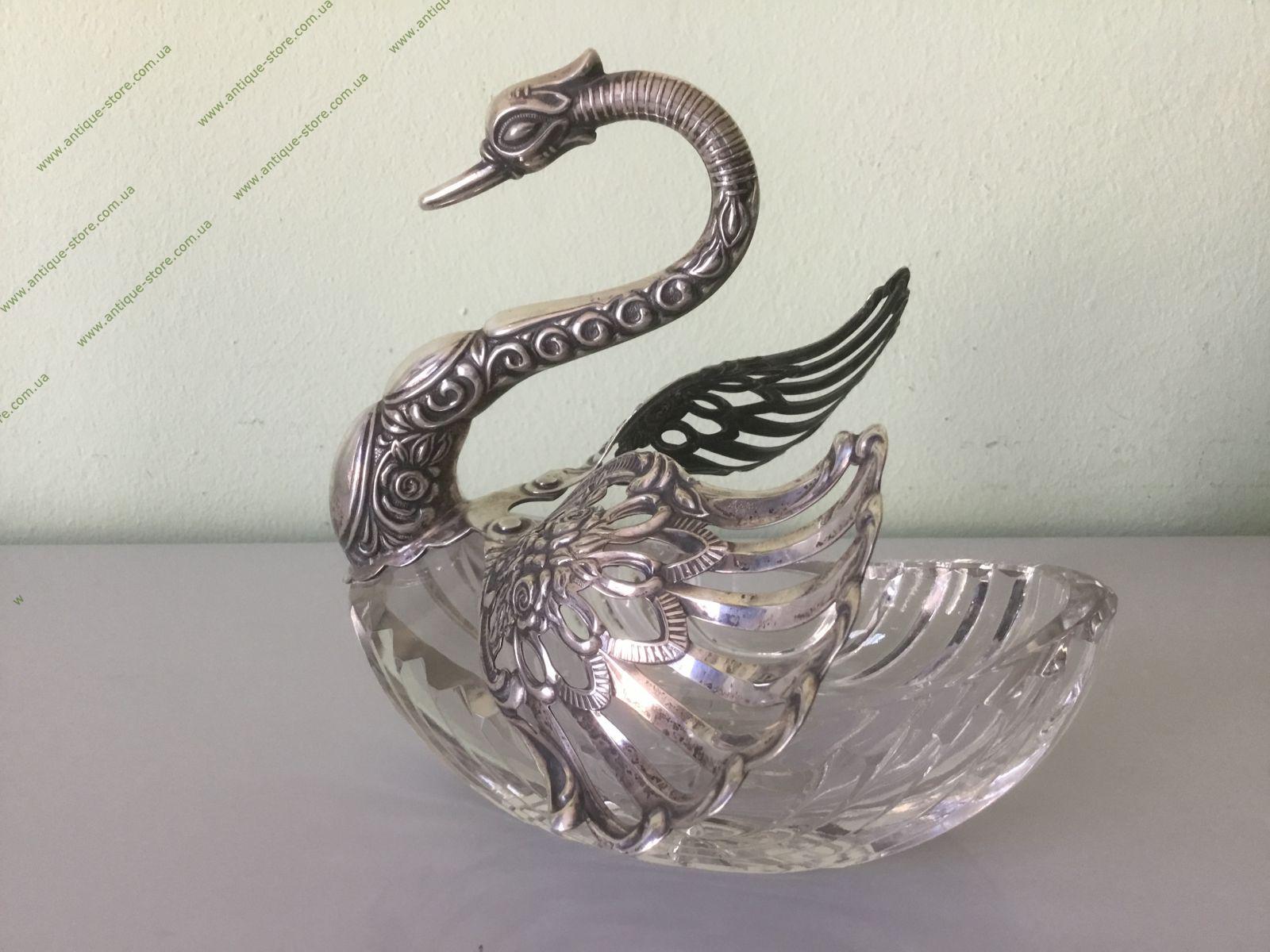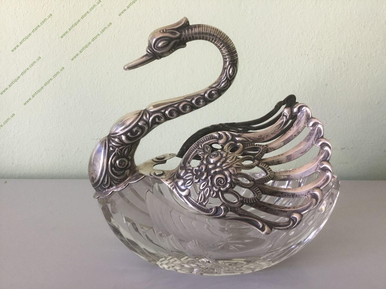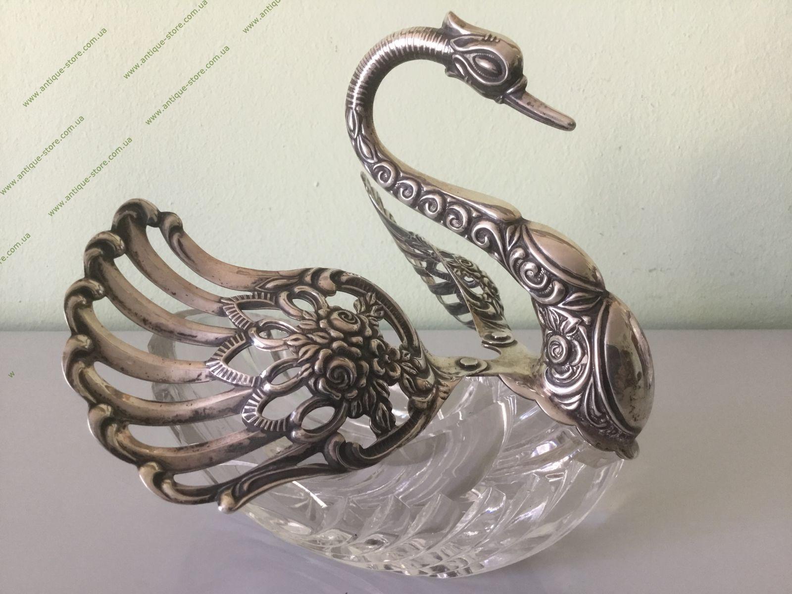 Великолепная серебряная вазочка из хрусталя и серебра 835˚. Клеймо ALBO. Выполнена в виде лебедя с раскрывающимися в стороны крыльями. Идеально подойдет для сервировки стола. Серебряная мини-ложечка с лебедем на черенке. Ложечка - серебро 835˚.