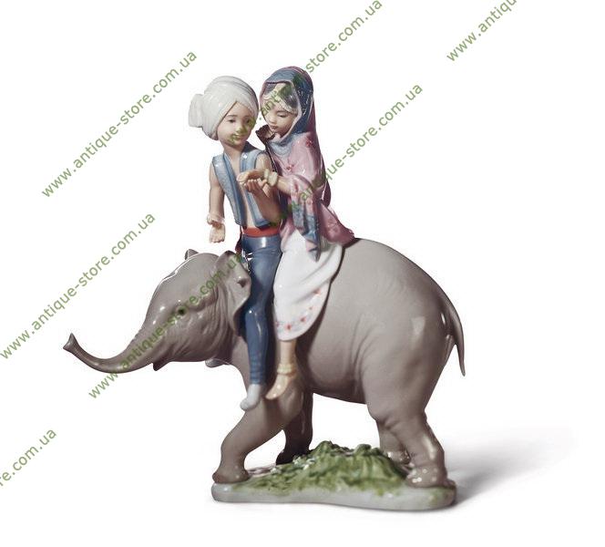 Статуэтка фарфоровая индийских детей, сидящих на слоне, производства Испании, фигура имеет номер в каталоге фирмы 01005352, Ядро, Ладро (Lladro), Испания
