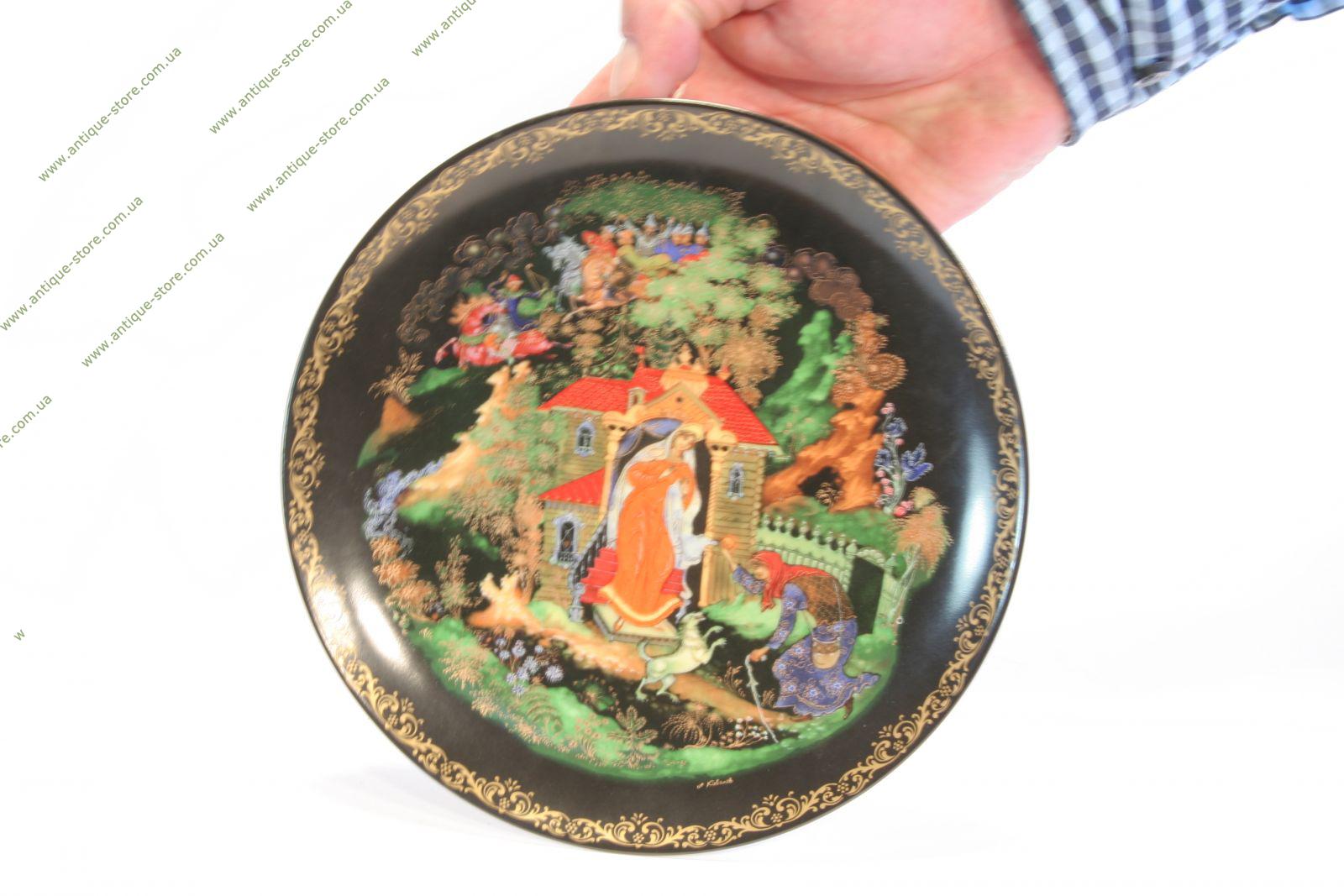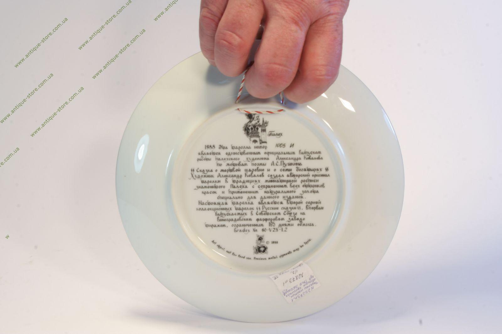 Декоративная тарелка с изображением сюжета сказки Пушкина "Сказка о мертвой царевне и о семи богатырях". Фарфор, роспись, золочение. Палех, СССР, 1988 год, на обратной стороне - описание.