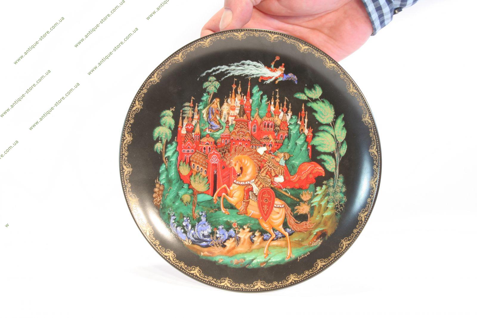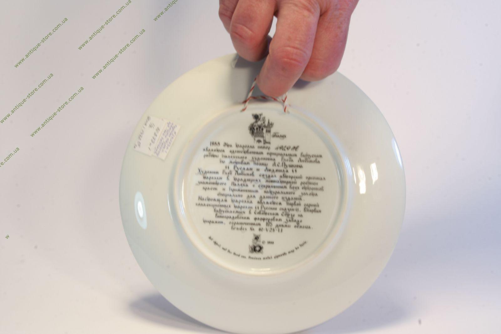 Декоративная тарелка с изображением сюжета сказки Пушкина "Руслан и Людмила", палехский фарфор, золочение, на обратной стороне - описание.