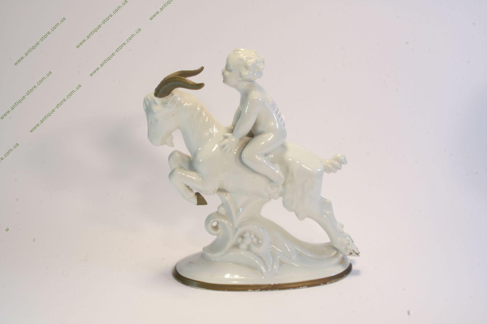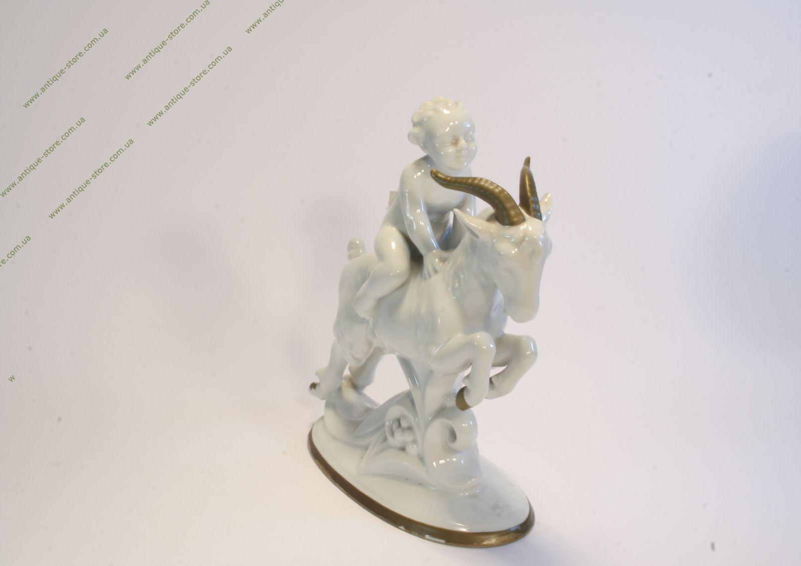 Фарфоровая статуэтка путти на козленке. Фигура из белого фарфора с золотыми деталями - фигурка производства немецкой мануфактуры. На цоколе знак мануфактуры CN.