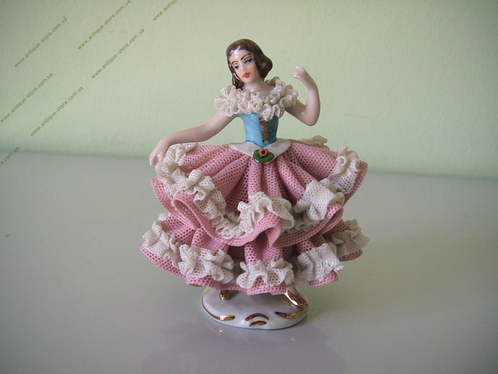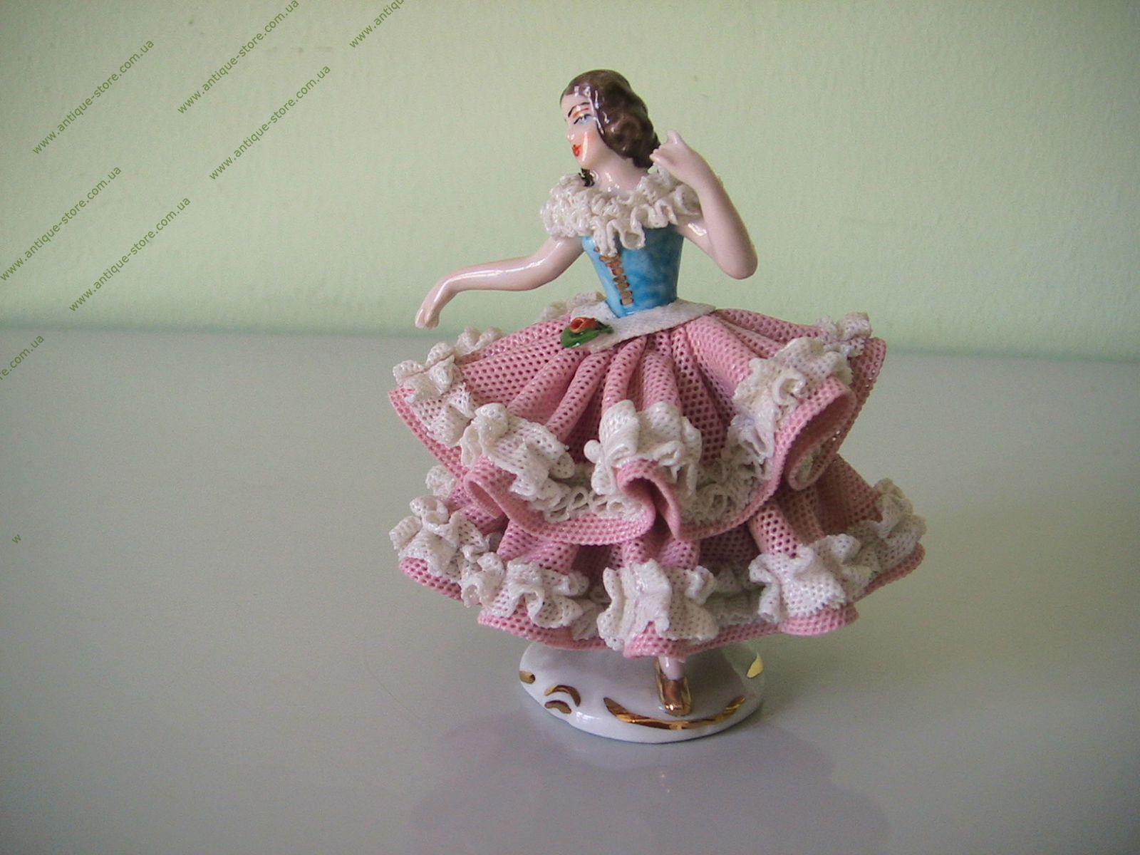 Коллекционная фарфоровая статуэтка "Девушка в голубом кружевном платье" изготовлена из знаменитого кружевного дрезденского фарфора, Дрезден (Dresden).