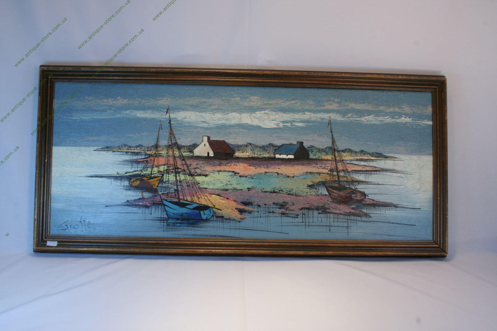 Рыбачий поселок с домами и парусниками на берегу моря, написанный в современном стиле. Внизу подпись автора.