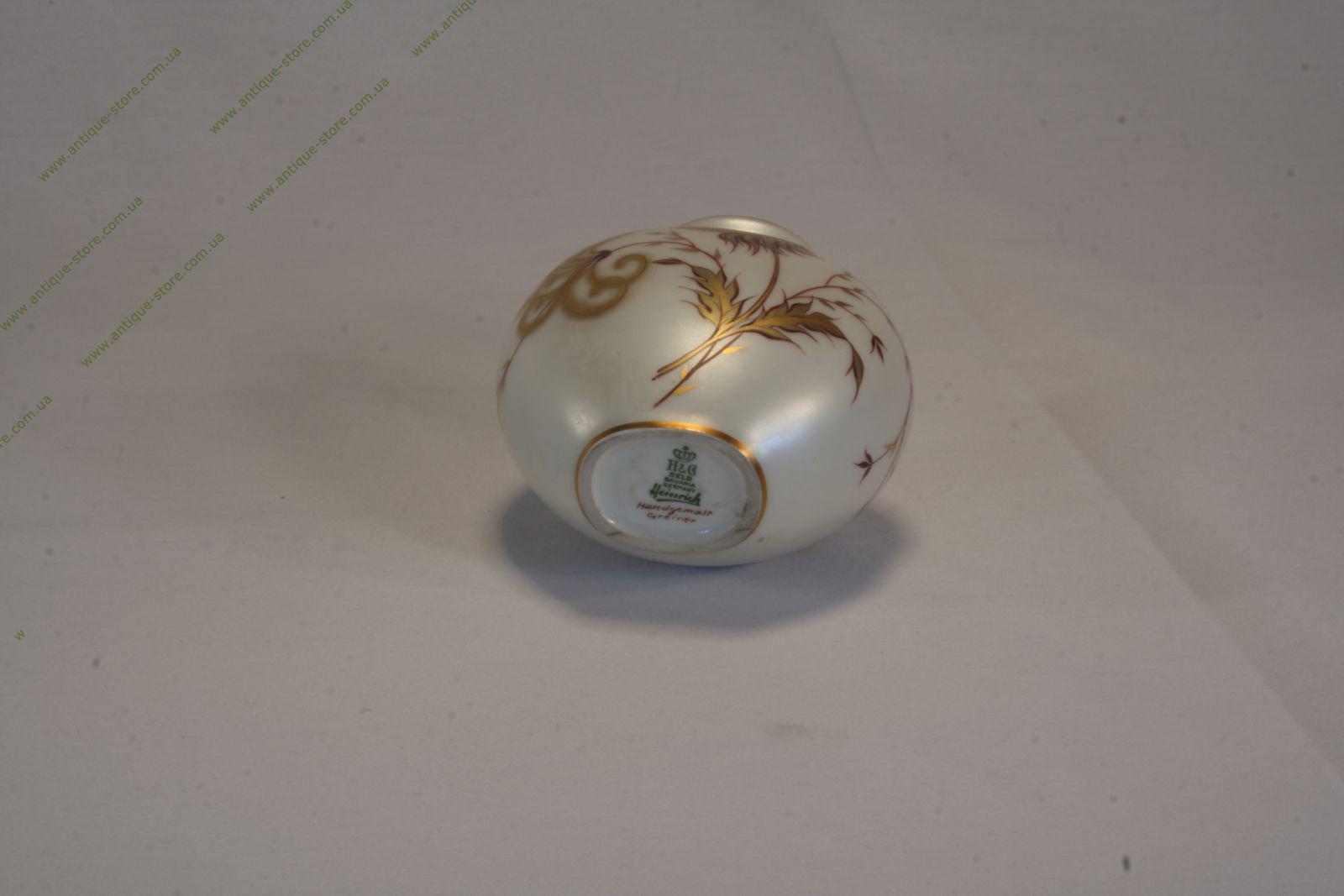 Миниатюрная вазочка из перламутрового фарфора с рисунком в виде одуванчика cбоку.