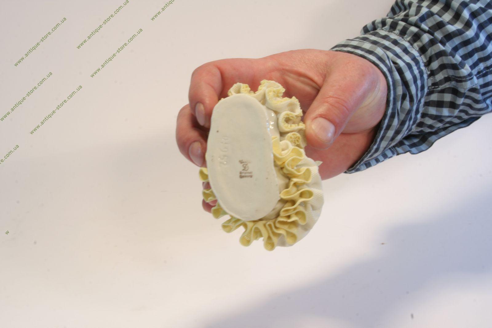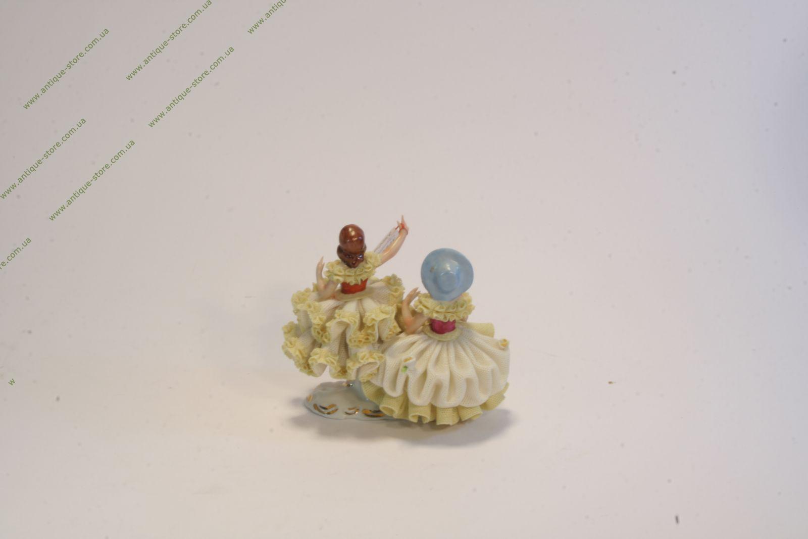 Коллекционная фарфоровая статуэтка "Две девушки в желтых кружевных платьях и шляпках", изготовлена из знаменитого кружевного фарфора, Дрезден (Dresden).