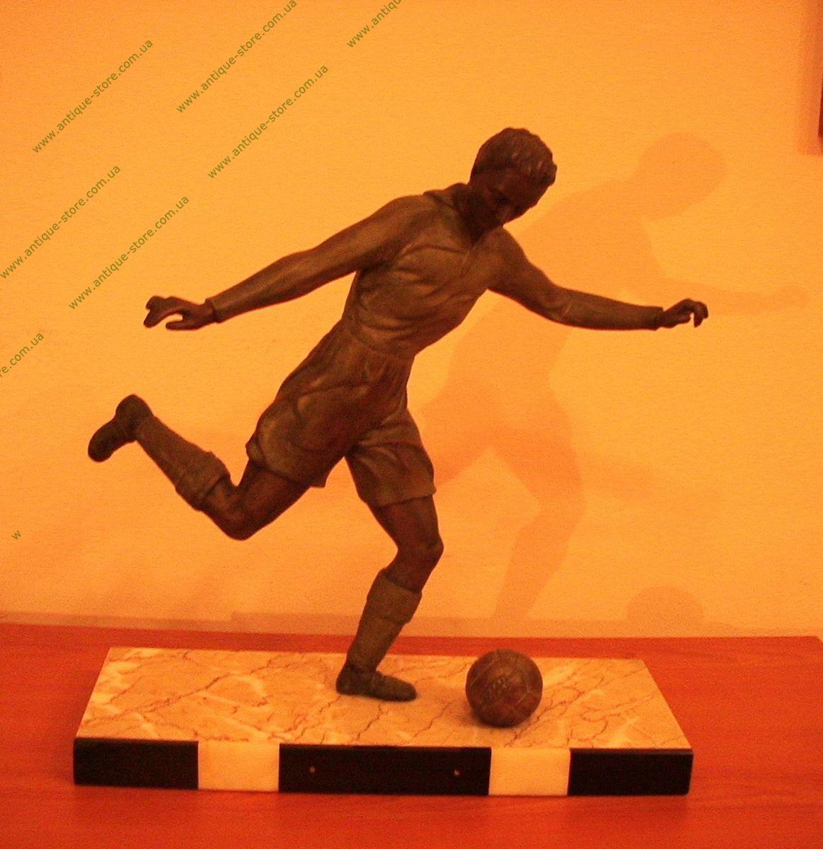Металлическая фигура футболиста со следами времени на мраморной подставке.