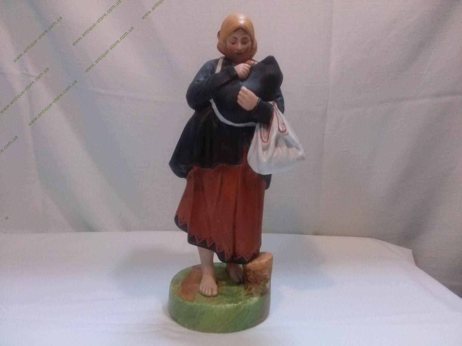 Фигура одинокой, босоногой крестьянки с младенцем на руках. Бисквит, полихромная роспись. Марка: красная надглазурная "Росстекло-фарфор Москва" под серпом и молотом.. Создана по эскизам и на базе завода "Гарднер". Аналогичная скульптура опубликована в каталоге «Гарднеръ «ХVIII - XIX». Фарфоровая пластика». Издательский дом «Говоровъ и сыновья», 2002 г.,