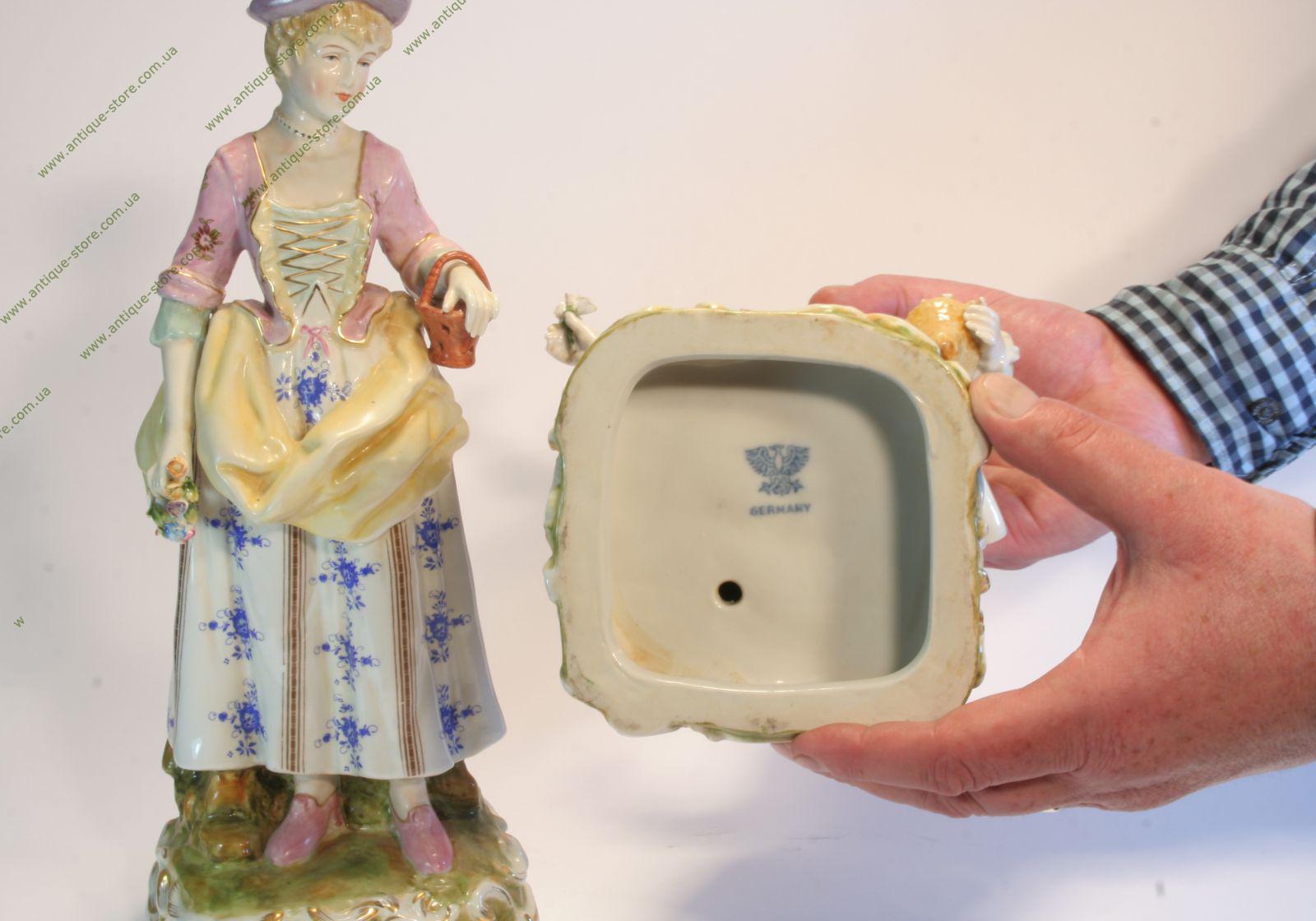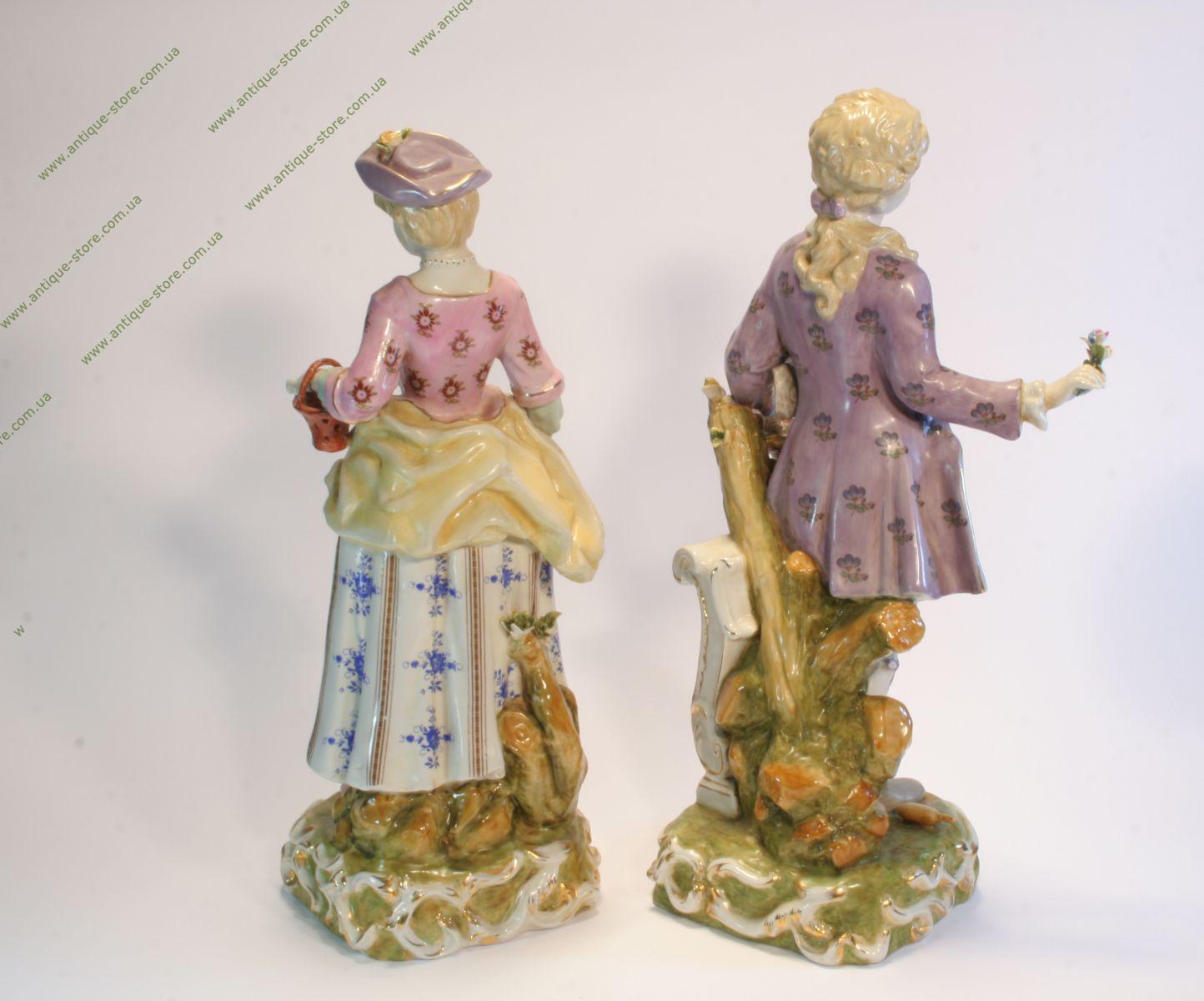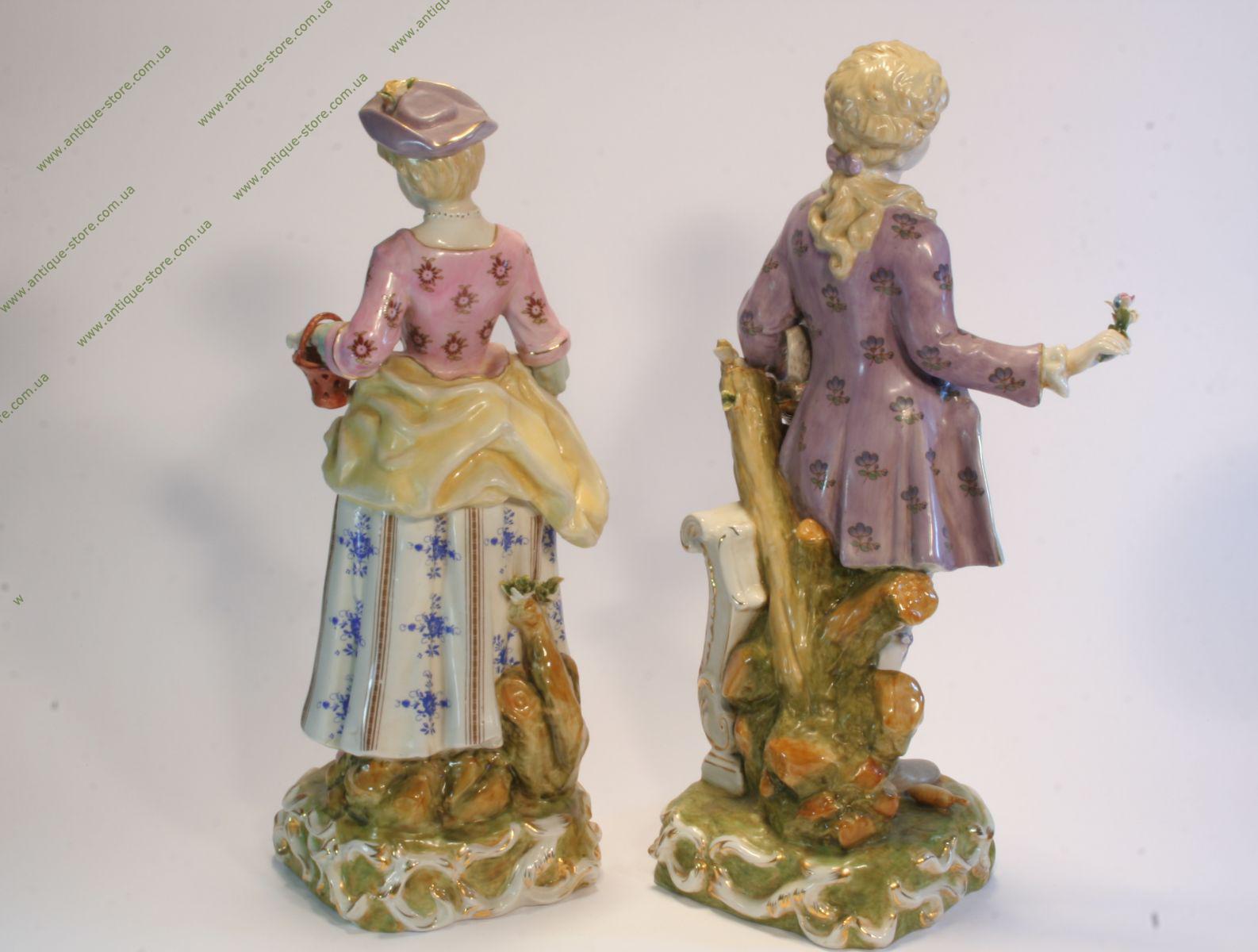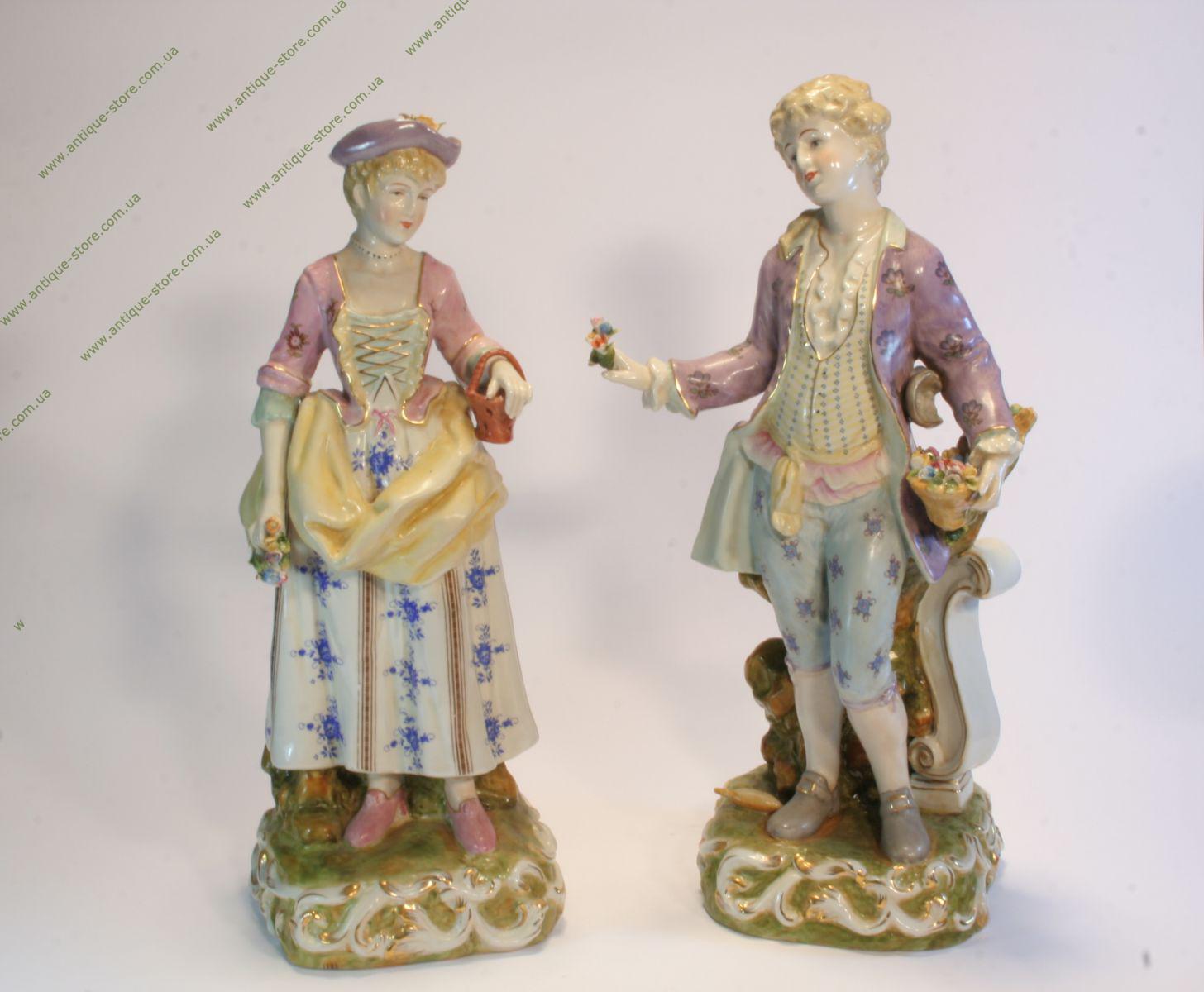 Две фарфоровые фигуры, изображающие кавалера и барышню с букетами цветов в руках. Фарфор, клеймо Орел, Германия.