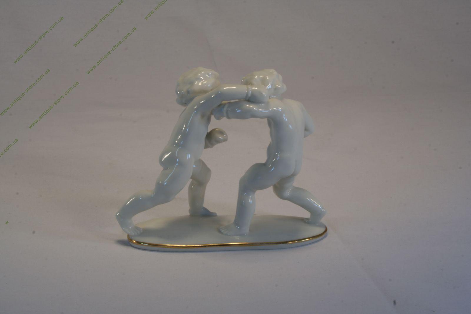 Боксирующие путти. Фарфоровая фигура изготовлена из белого фарфора на подставке. Фигурка с клеймом на обратной стороне и штемпелем американской зоны. Работа знаменитого художника К.Туттера (K.Tutter) (1883-1969). Производство крупнейшего немецкого концерна Hutschenreuther (Хутченройтер), основанного в 1814 году в Баварии художником Карлом Магнусом Хутченройтером.
