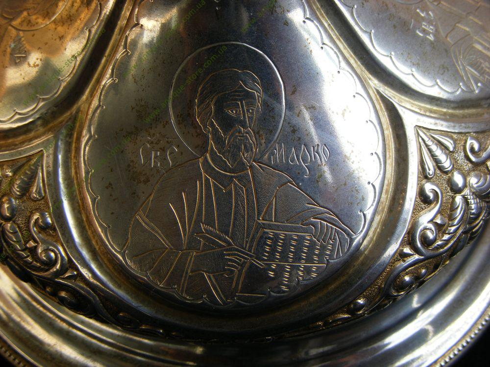 Серебро 84°. Клейма: мастера Клеймо Московского окружного пробирного управления с инициалами управляющего округом Ивана Сергеевича Лебедкина, назначен 1899 году и клеймо мастера А.Ф в овале Фульд Александр Иосифович ,владелец фабрики серебряных изделий,1862-1917 гг. Прекрасный подарок приходскому храму или монастырю!!!
