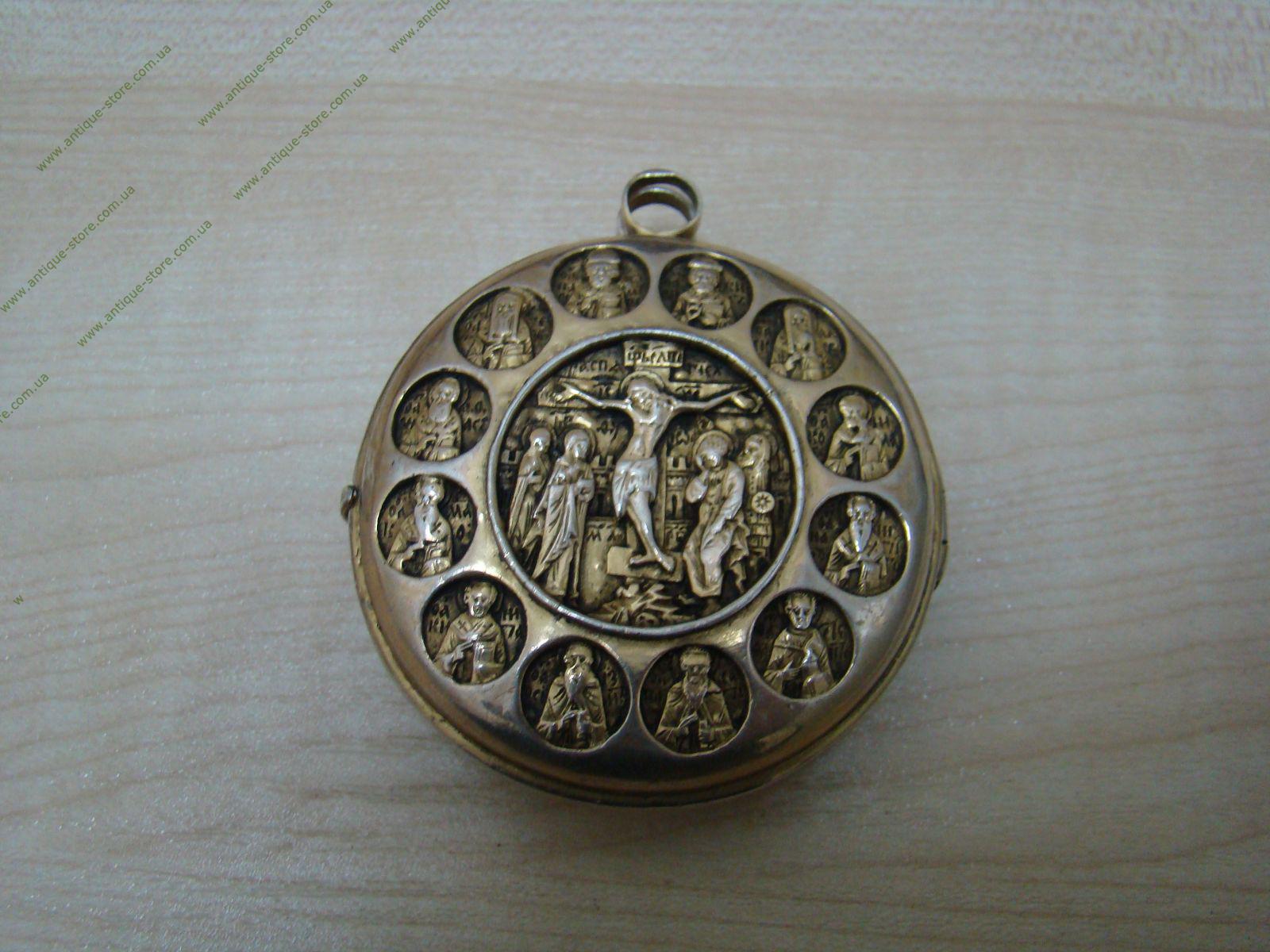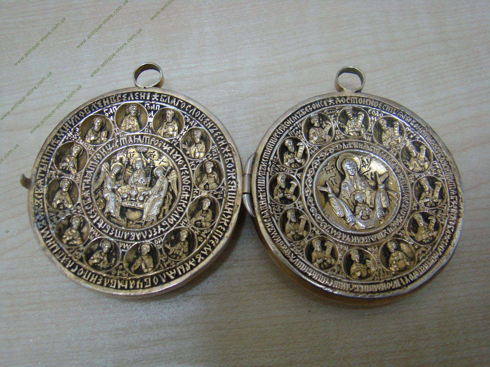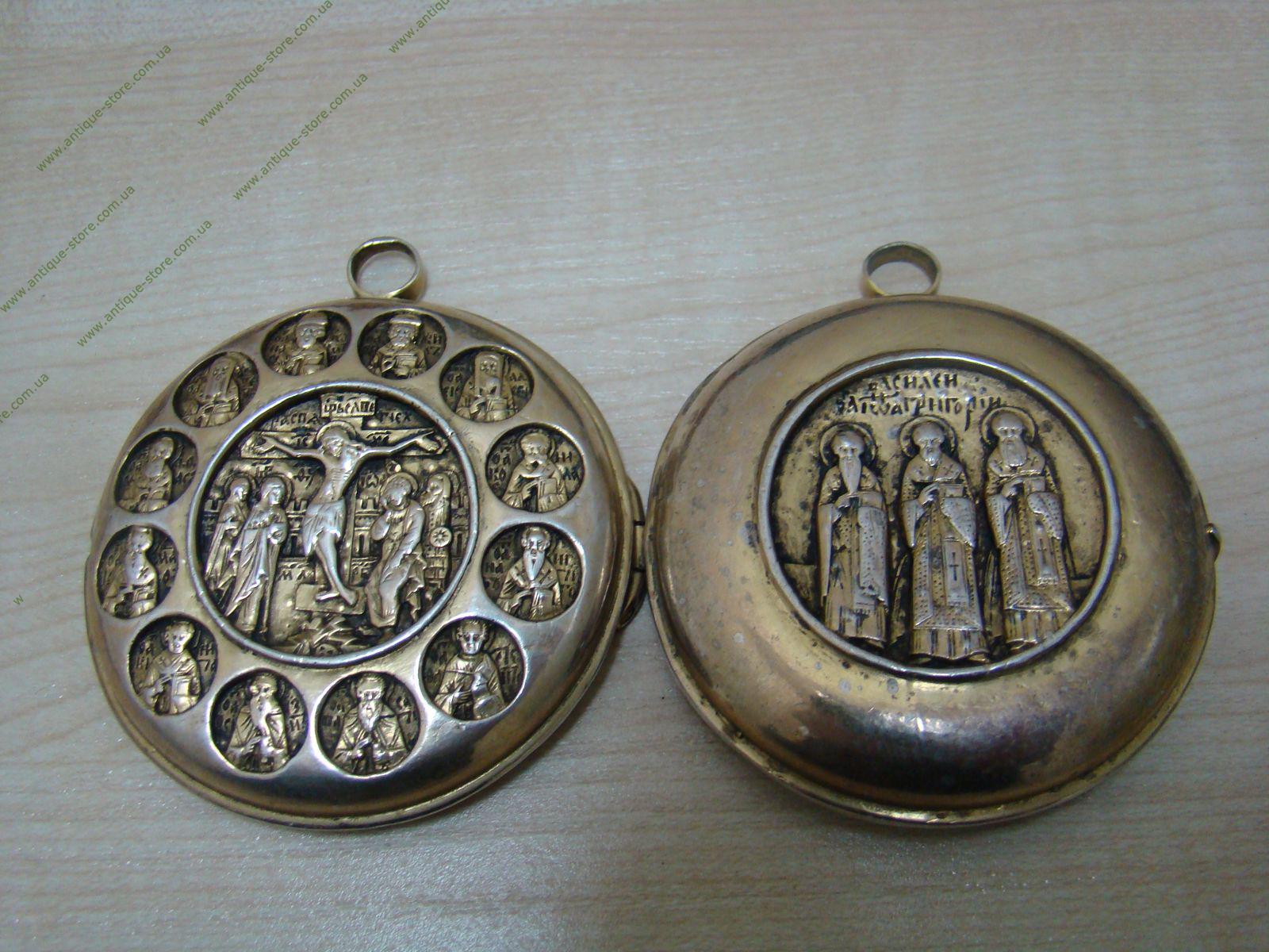 Редкая двухстворчатая серебряная икона-складень, или пуиная Панагия . На Иконе изображены сюжеты: во внутренней части Богородица Знамение с предстоящими и Святая Троица с предстоящими. На внешней стороне Три Святителя: Василий Великий, Григорий Богослов и Григорий Нисский и Распятие Христово. Серебро не маркированное, т. к. очень старая.