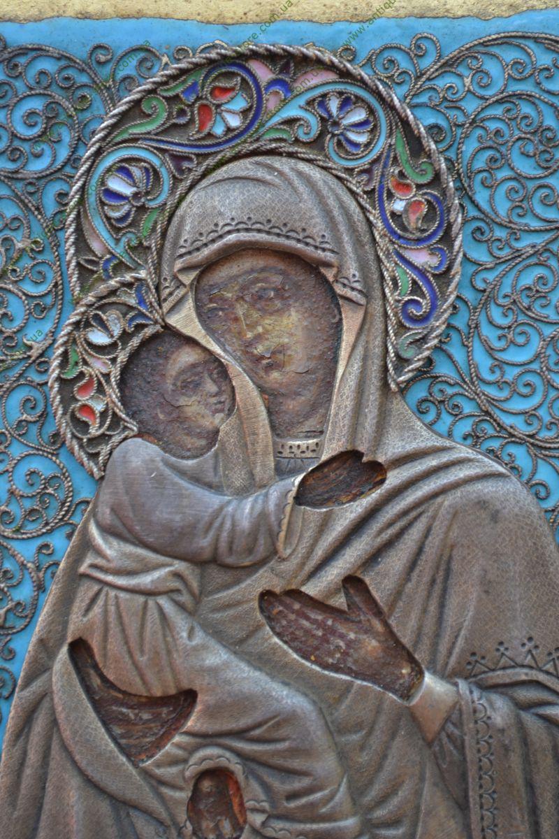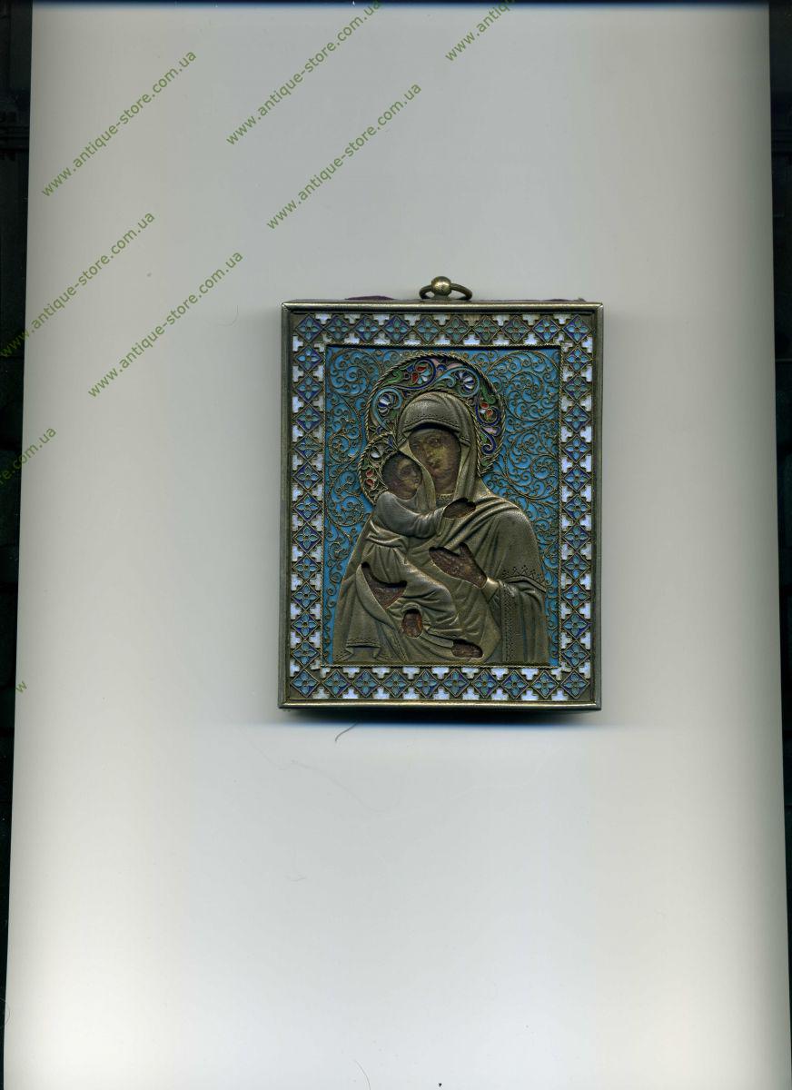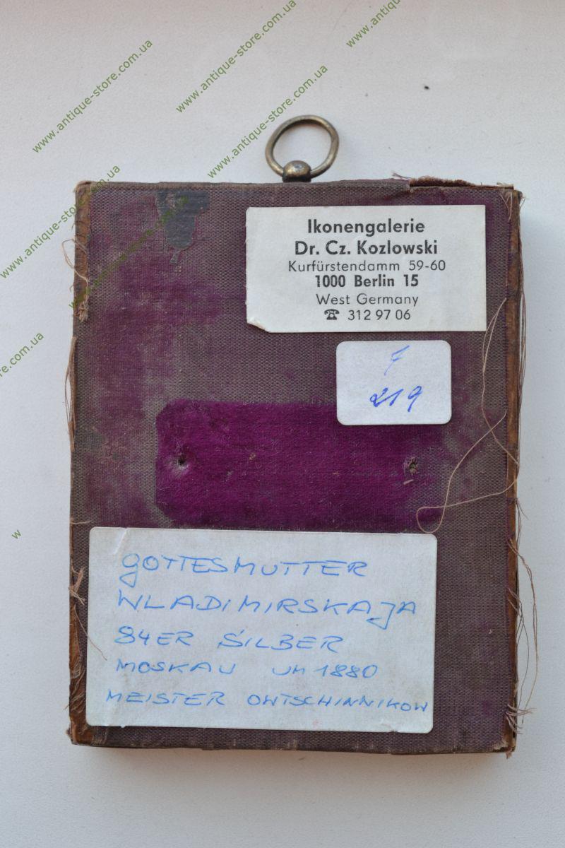 Икона “Владимирская Божья Матерь”, писана на цинке, оклад серебро 84°, эмаль, 1882 год, мастер П.Овчинников (поставщик двора), клейма 84, Овчинниковъ, 1882.