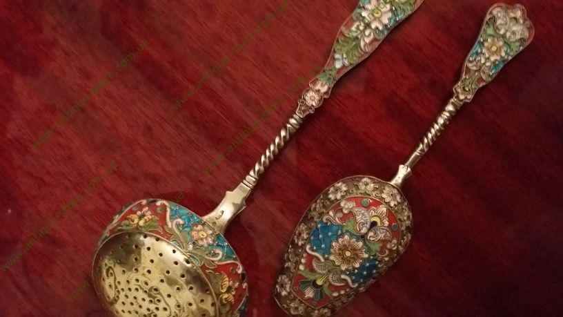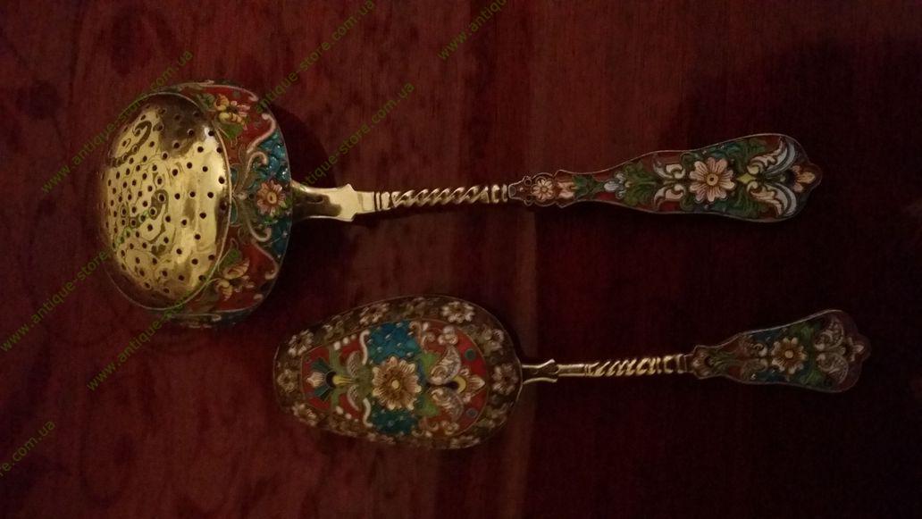 Набор серебряный (серебро 88°) с эмалями: совочек для сахара и ковшик. Российская империя, 19 век. Автор Мария Семенова.