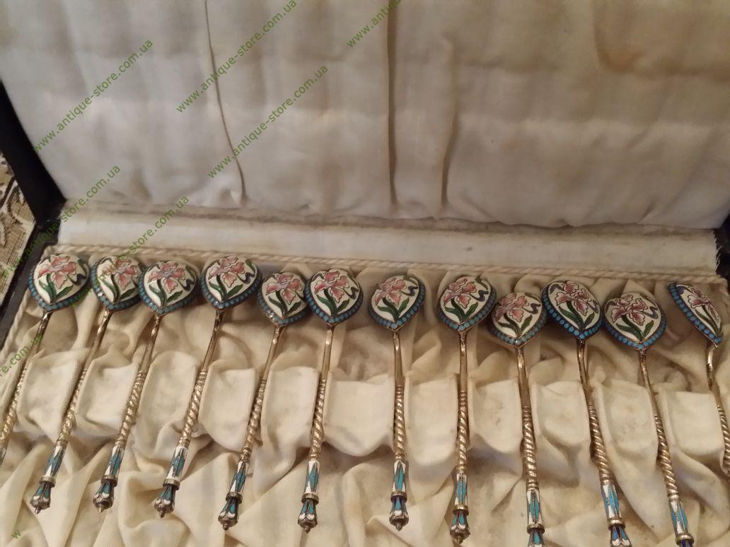 Ложки кофейные, серебряные (6 ложек -88° и 6 ложек — 84°) с эмалями. Автор Николай Алексеев.