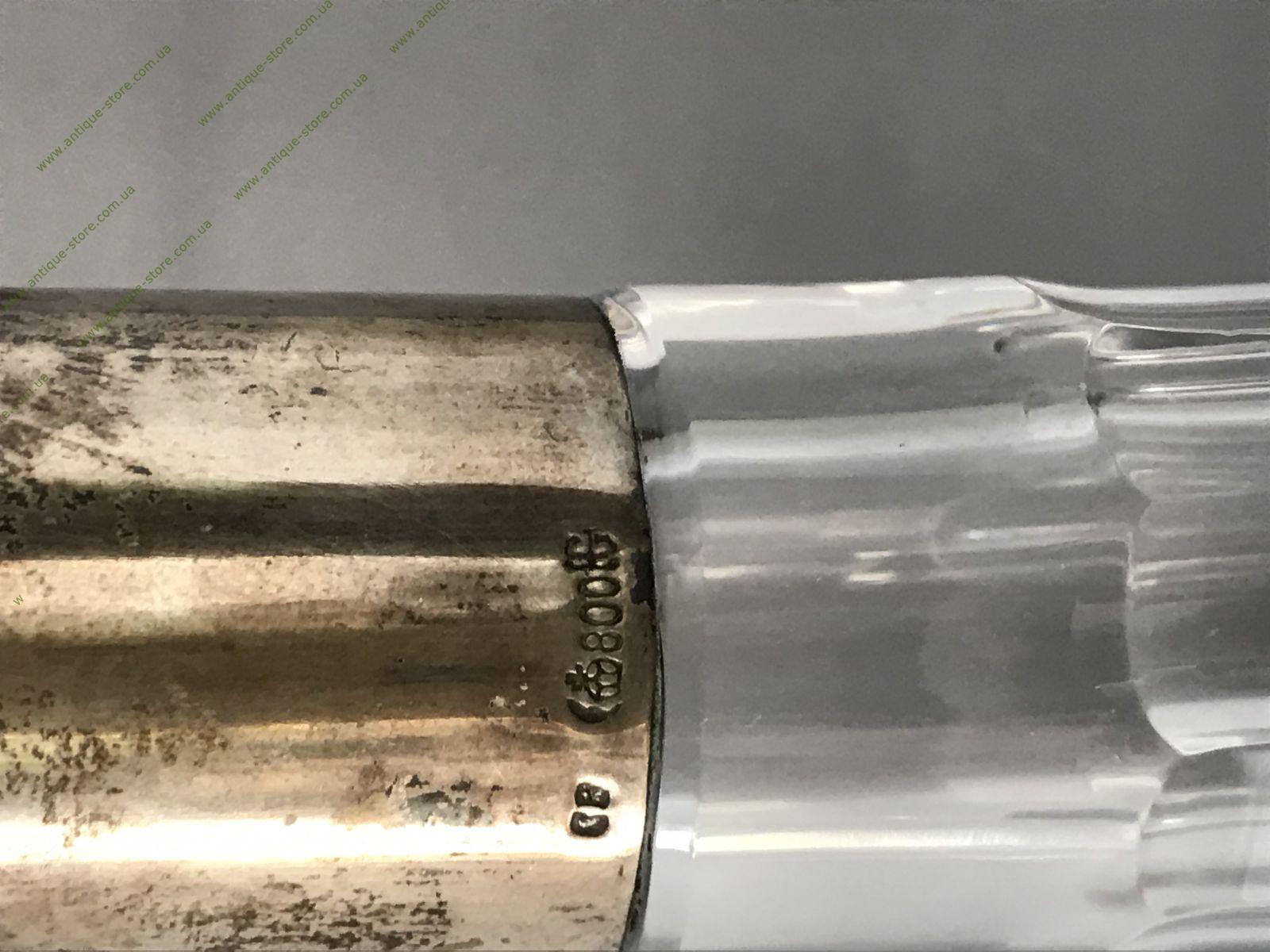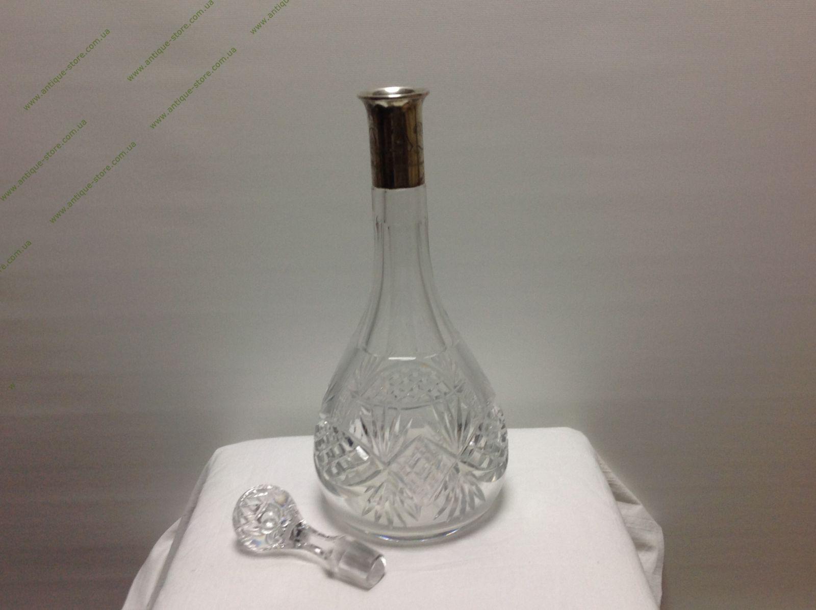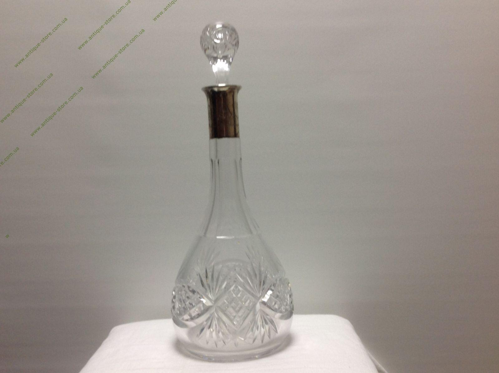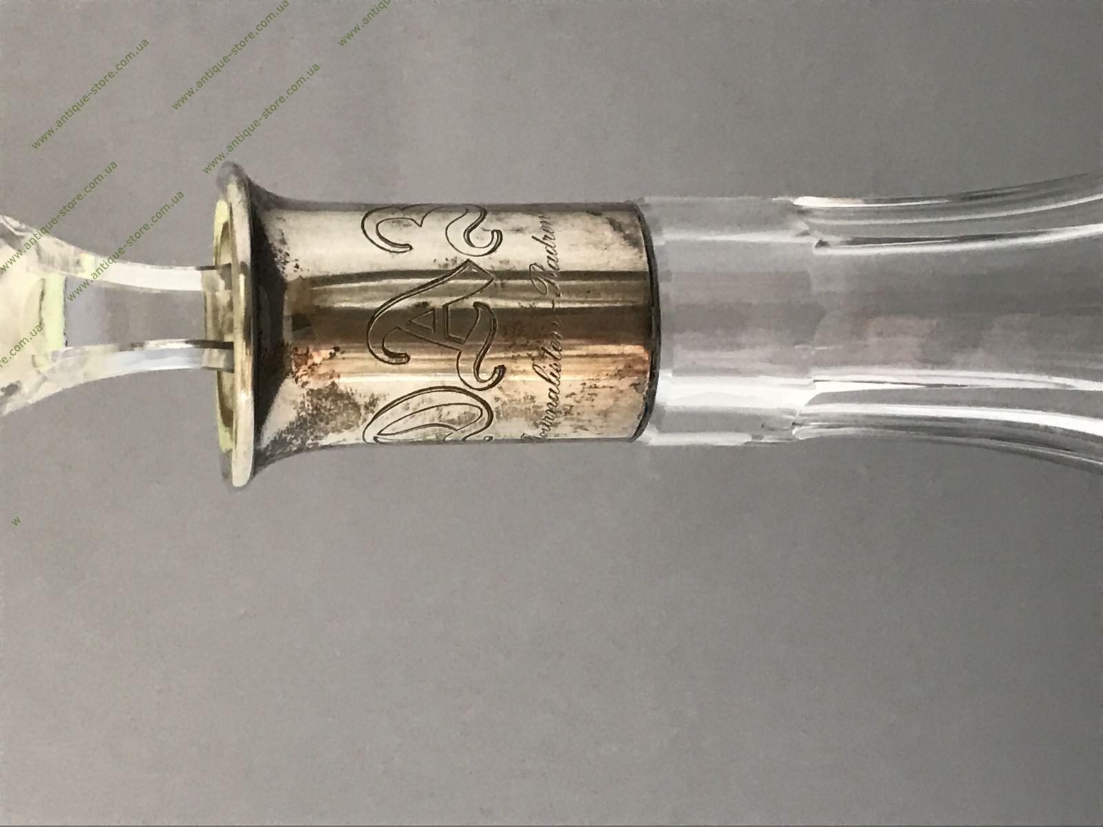 Графин из хрусталя, тонкой работы с серебряным горлышком (800°), с клеймом в виде короны и полумесяца (Германия, нач. 20-го века) . Объем 1 литр . С гравировкой DA3. Без повреждений.