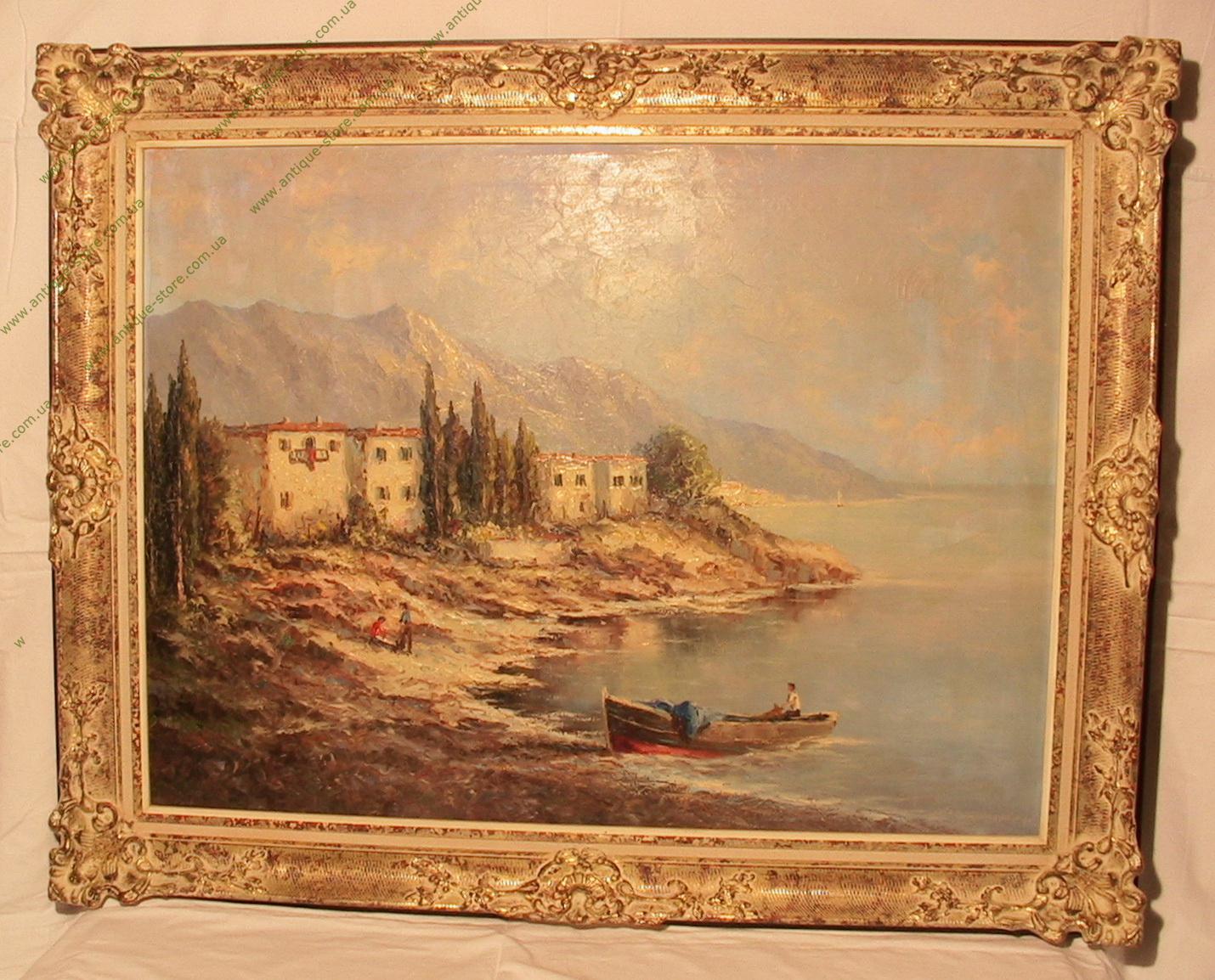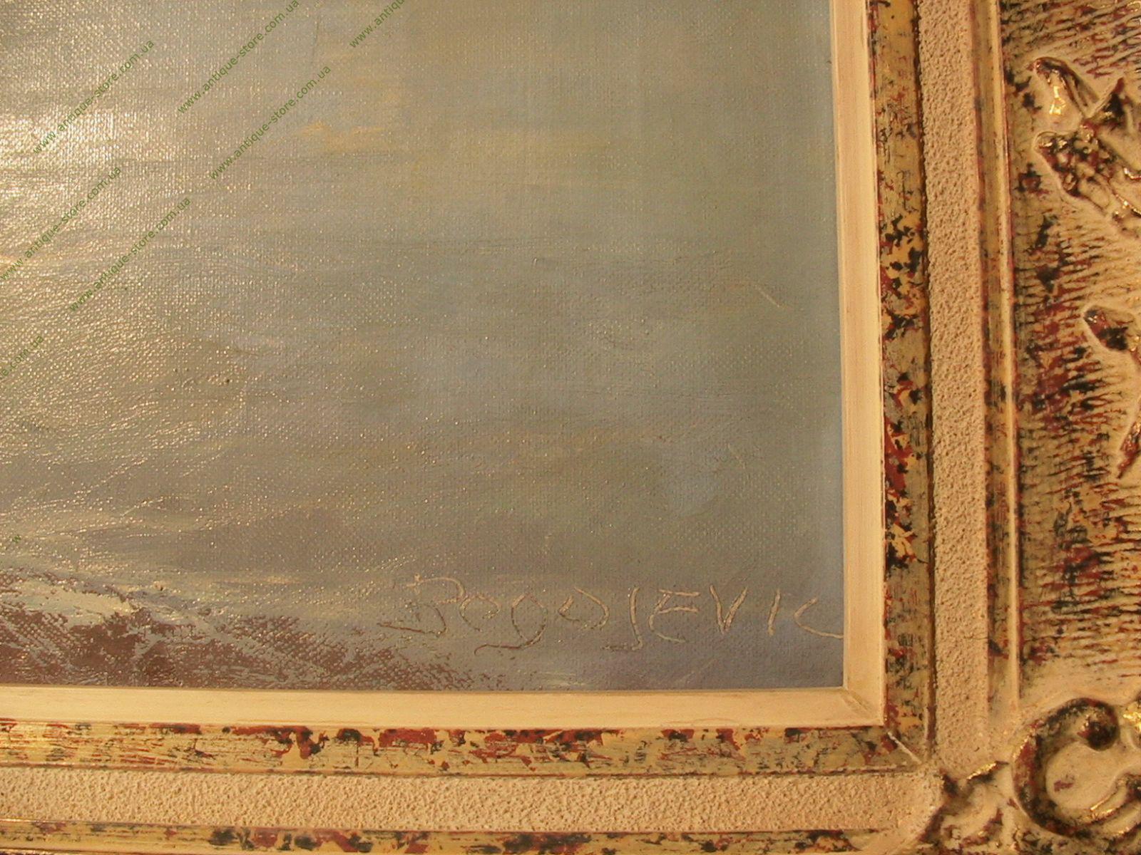 Картина "Горное озеро" известного немецкого художника и гравера Ганса Богоевича (Hans Bogojevic). С 1928 Ханс Богоевич - член группы нюренбергских художников "Freie Sezession". С 1930 выставляется в Париже. В 1950 участвовал в выставке Берлинского изобразительного искусства в Будапеште и Вене. Работы Ханса Богоевича приобретала императрица Hermine, они находятся в Лувре и музеях Берлина. Справа внизу подпись автора.