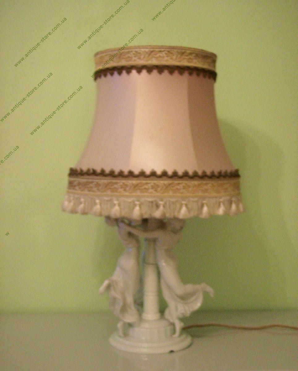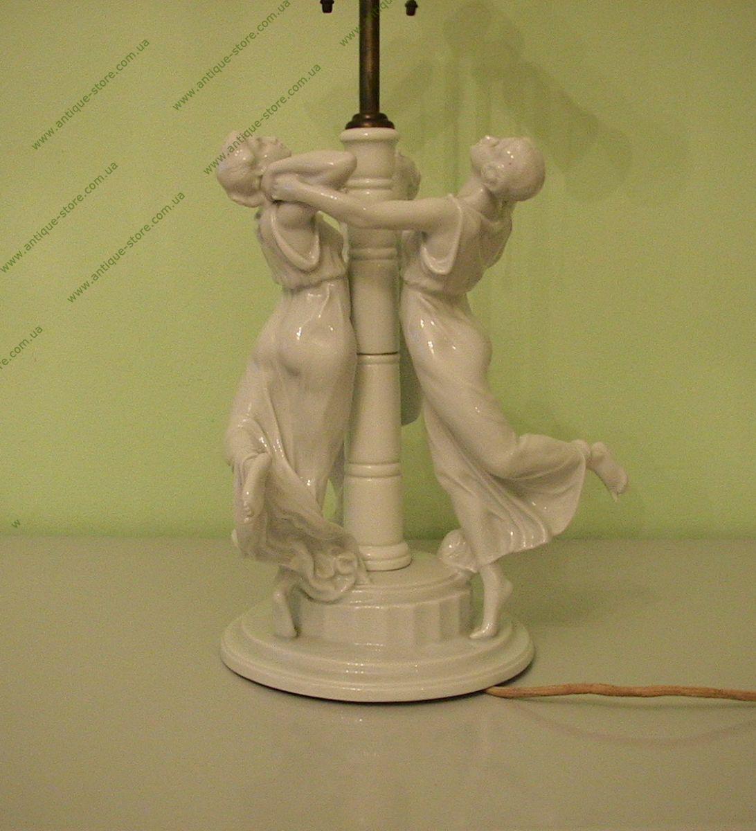Великолепная настольная лампа из белого фарфора, изображающая танец в исполнении трех сестер Визенталь, модель разработана знаменитым художником мануфактуры Розенталь (Rosenthal) Карлом Химмельштоссом (K. Himmelstoss) в 1913 г. украшена шелковым розовым абажюром. Технически исправна, в хорошем состоянии. Номер в каталоге K 210/1.