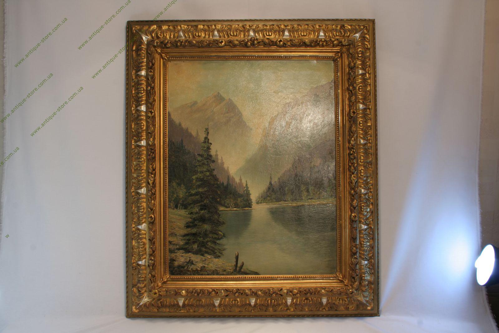 Горный пейзаж, изображающий альпийское горное озеро в обрамлении елей, слева внизу подпись автора.