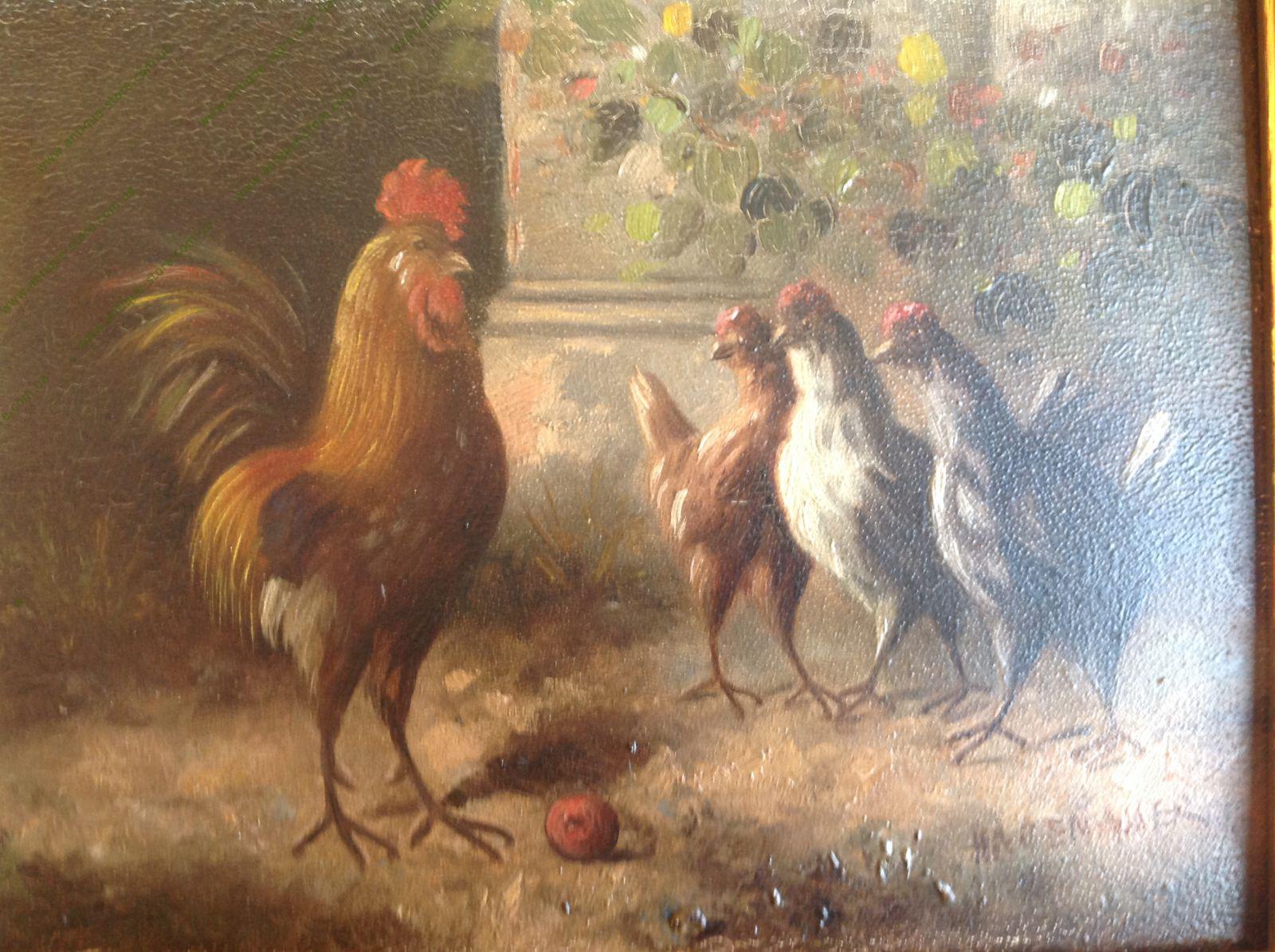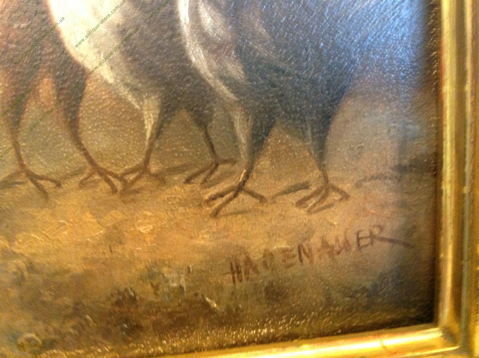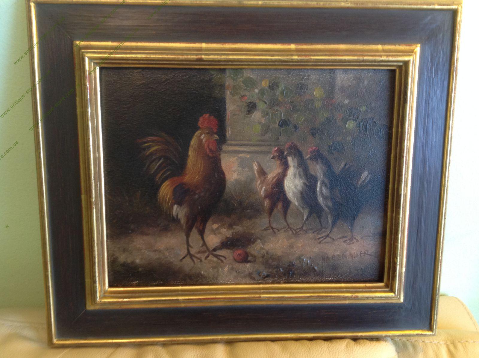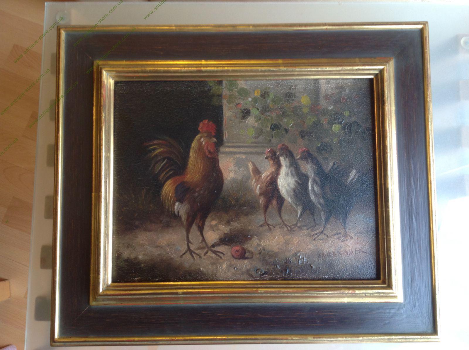 Жанровая сцена, изображающая птичий двор с петухом, принадлежащая кисти Хагенауэра (Hagenauer), немецкого художника, работавшего в середине 20-го века. Размер 32 х 33 с рамой