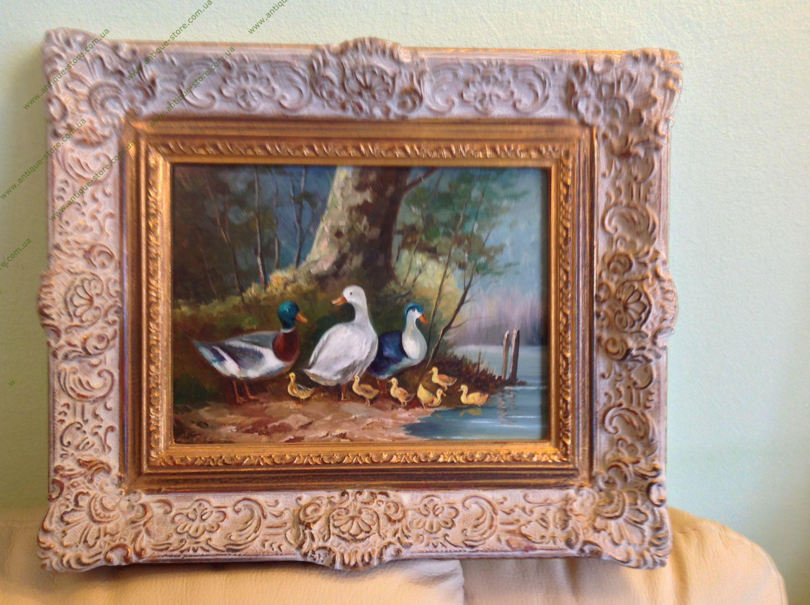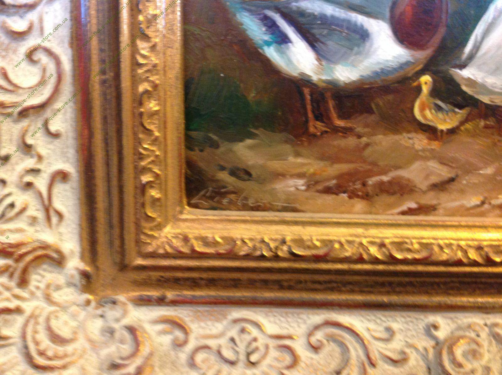 Утки на пруду. Утки на озере. Размер без рамы: 15 х 20 см, с рамой: 26 х32 см. Справа внизу — подпись автора: рама, Либерт (Liebert