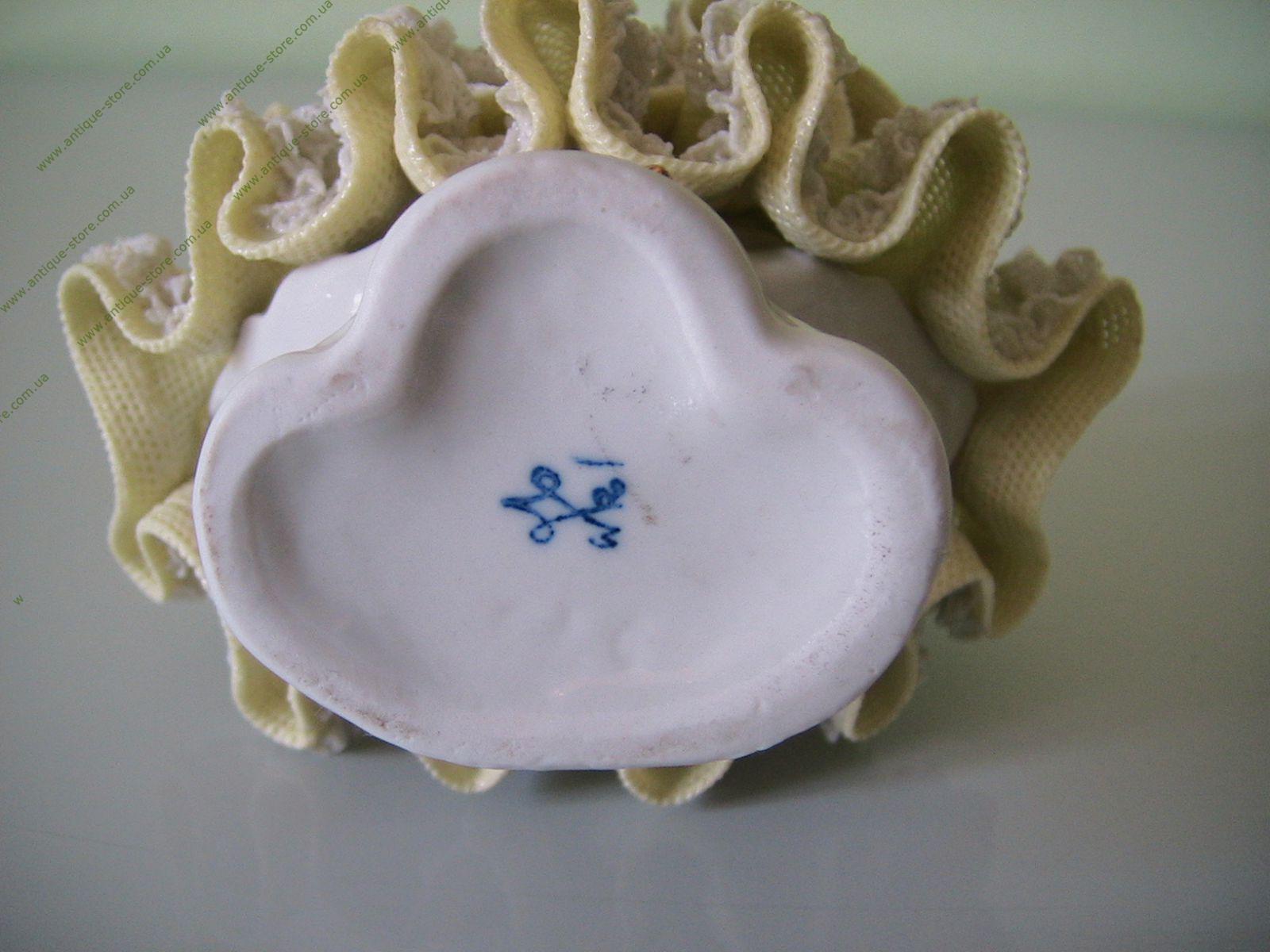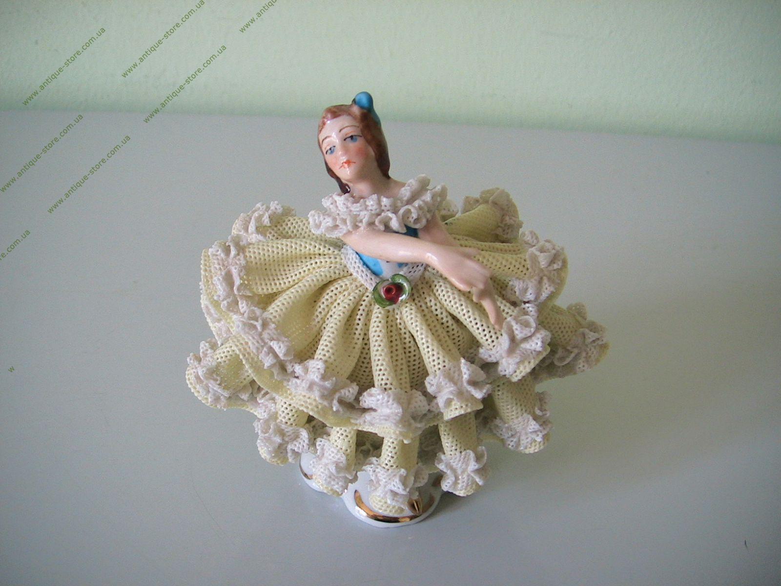 Коллекционная фарфоровая статуэтка "Девушка в желтом кружевном платье" изготовлена из знаменитого кружевного дрезденского фарфора, Дрезден (Dresden).