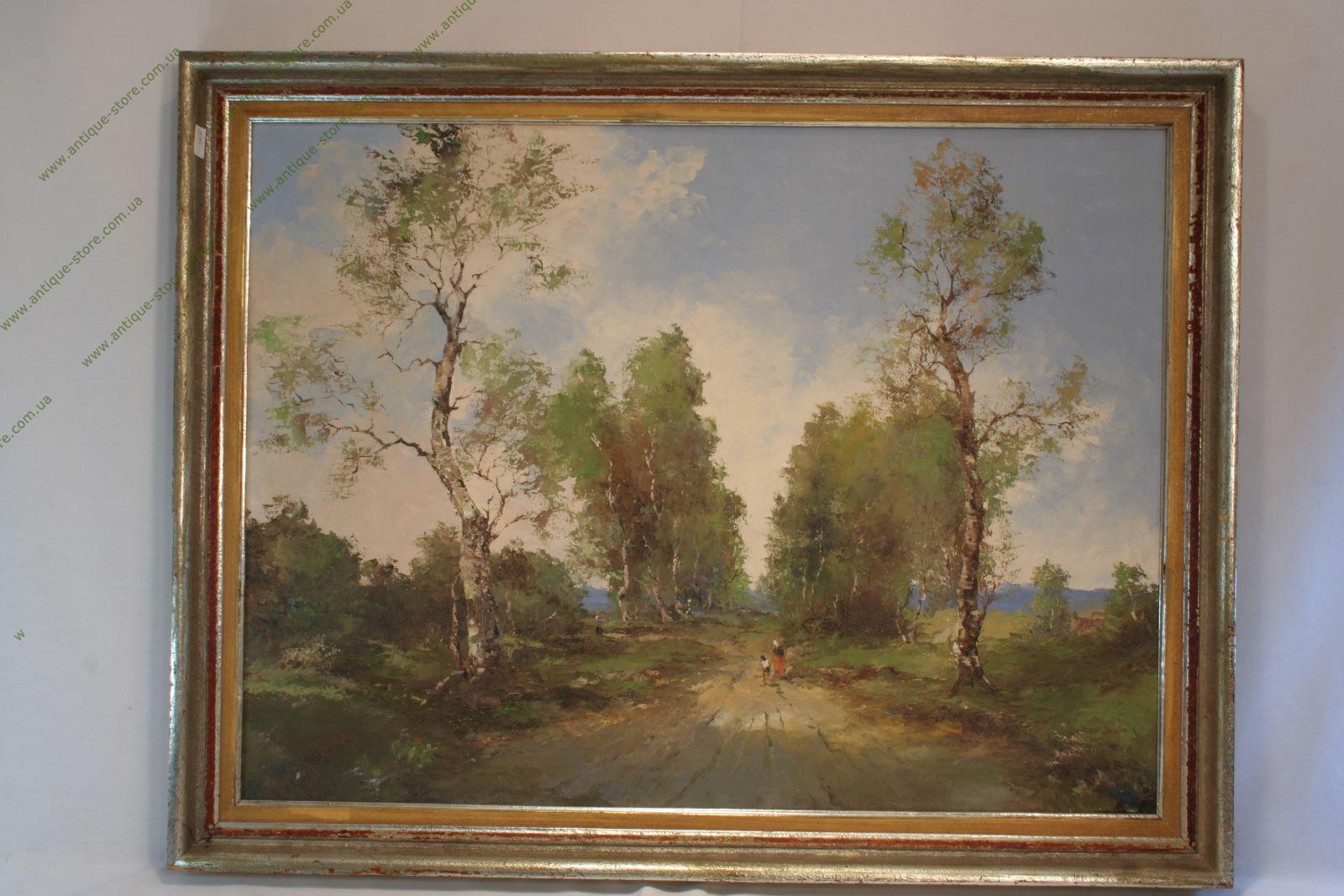 Пейзаж, изображающий проселочную дорогу с людьми и собаками, без подписи