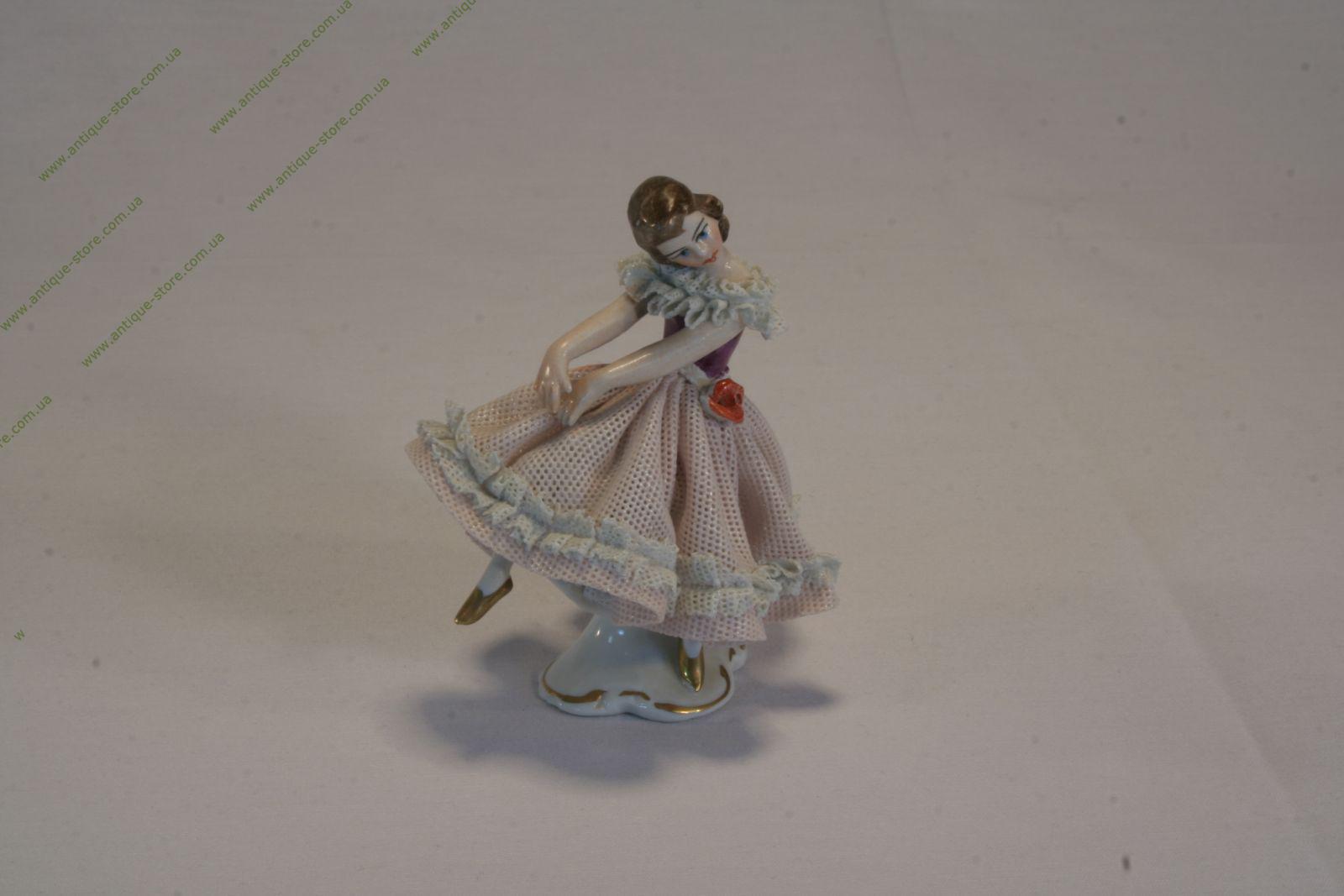 Коллекционная фарфоровая статуэтка "Балеринка в бело-розовом платье с цветком на боку", изготовлена из знаменитого кружевного дрезденского фарфора.
