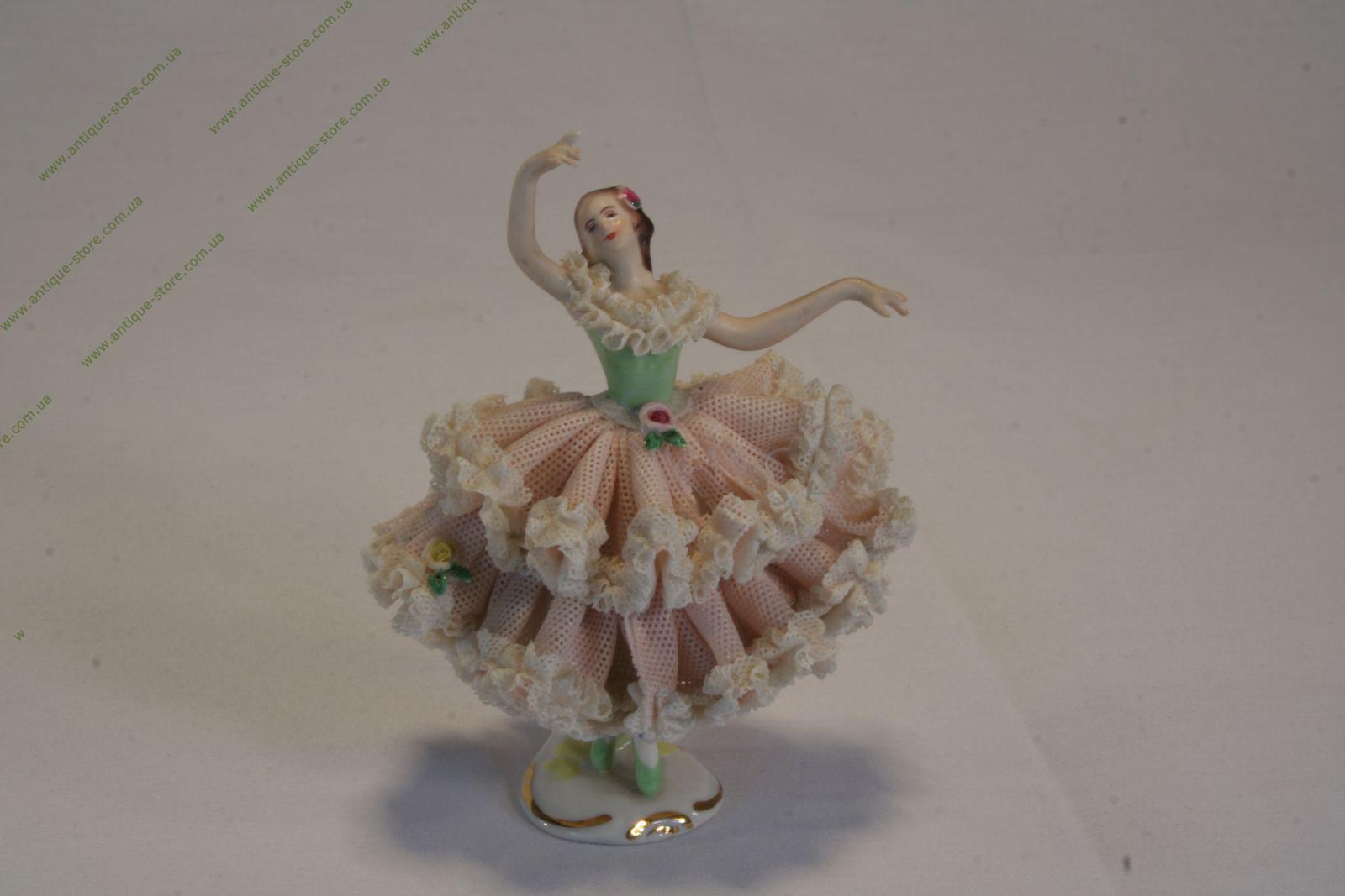 Коллекционная фарфоровая статуэтка «Балеринка в бело-розово-голубом платье» , изготовлена из знаменитого кружевного дрезденского фарфора.