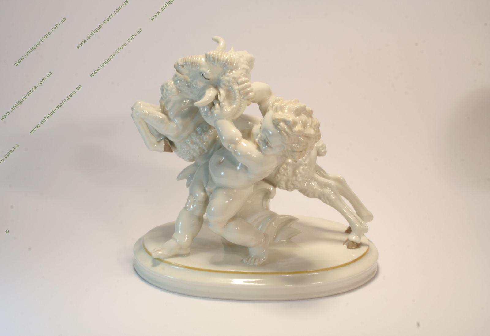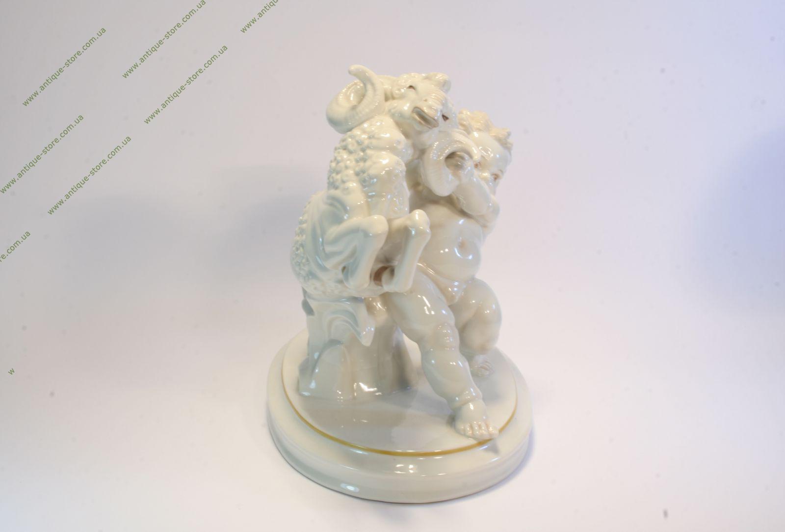 Путти (малыш), борющийся с бараном. Фигура изготовлена из белого фарфора на подставке. Фигура имеет название "Ubermut", что означает " Дерзость", с клеймом на обратной стороне. Работа знаменитого художника Карла Туттера (Karl Tutter), Moдель N. 904. Производство крупнейшего немецкого концерна Hutschenreuther (Хутченройтер), основанного в 1814 году в Баварии художником Карлом Магнусом Хутченройтером.