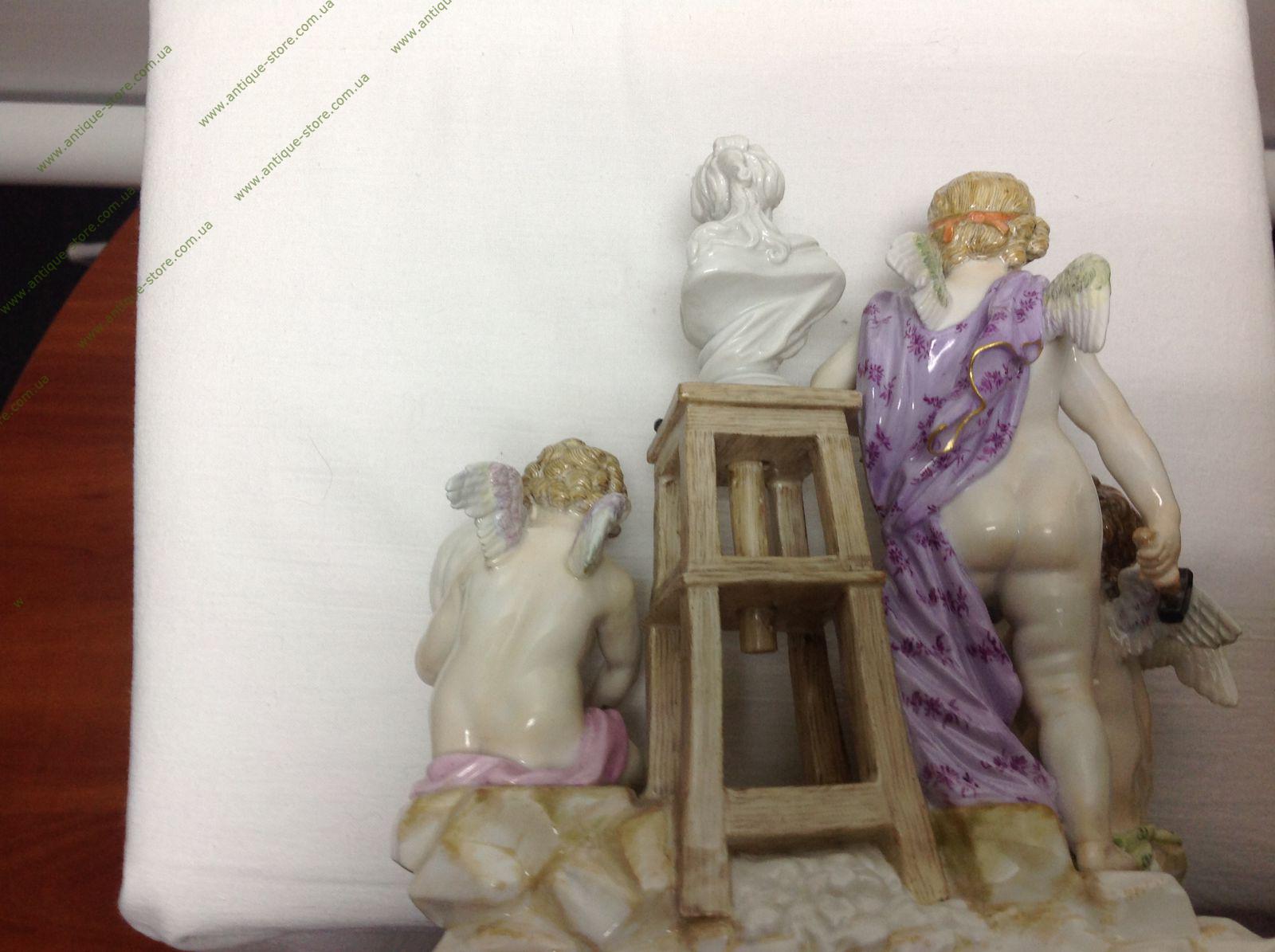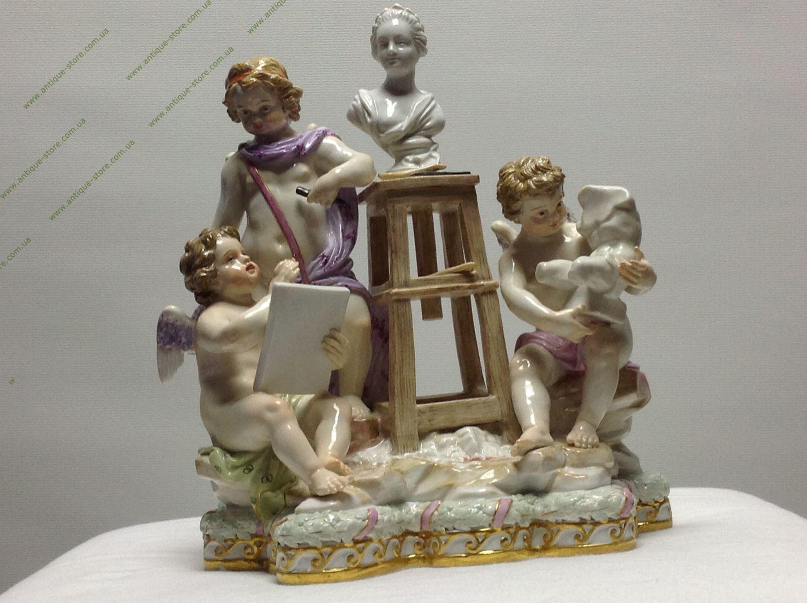 Фарфор, полихромная роспись, золочение, лепка. Марка: синим подглазурно "скрещенные мечи". Германия, Мейсенская фарфоровая мануфактура. . Выполнено по модели Михеля Виктора Асье. Скульптурная композиция включает в себя три фигуры амуров Фигура входила в "Большой русский заказ" для кабинета Екатерины II в 1774 г. Многообразие элементов и изящество их исполнения характерны для лучших произведений мейсенской мануфактуры.