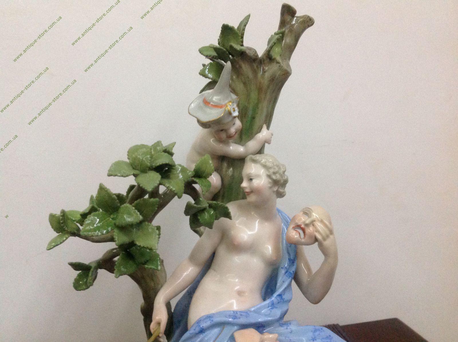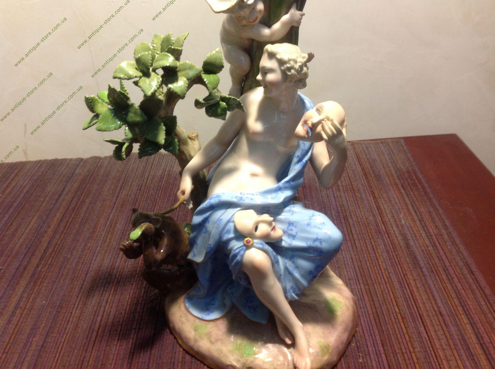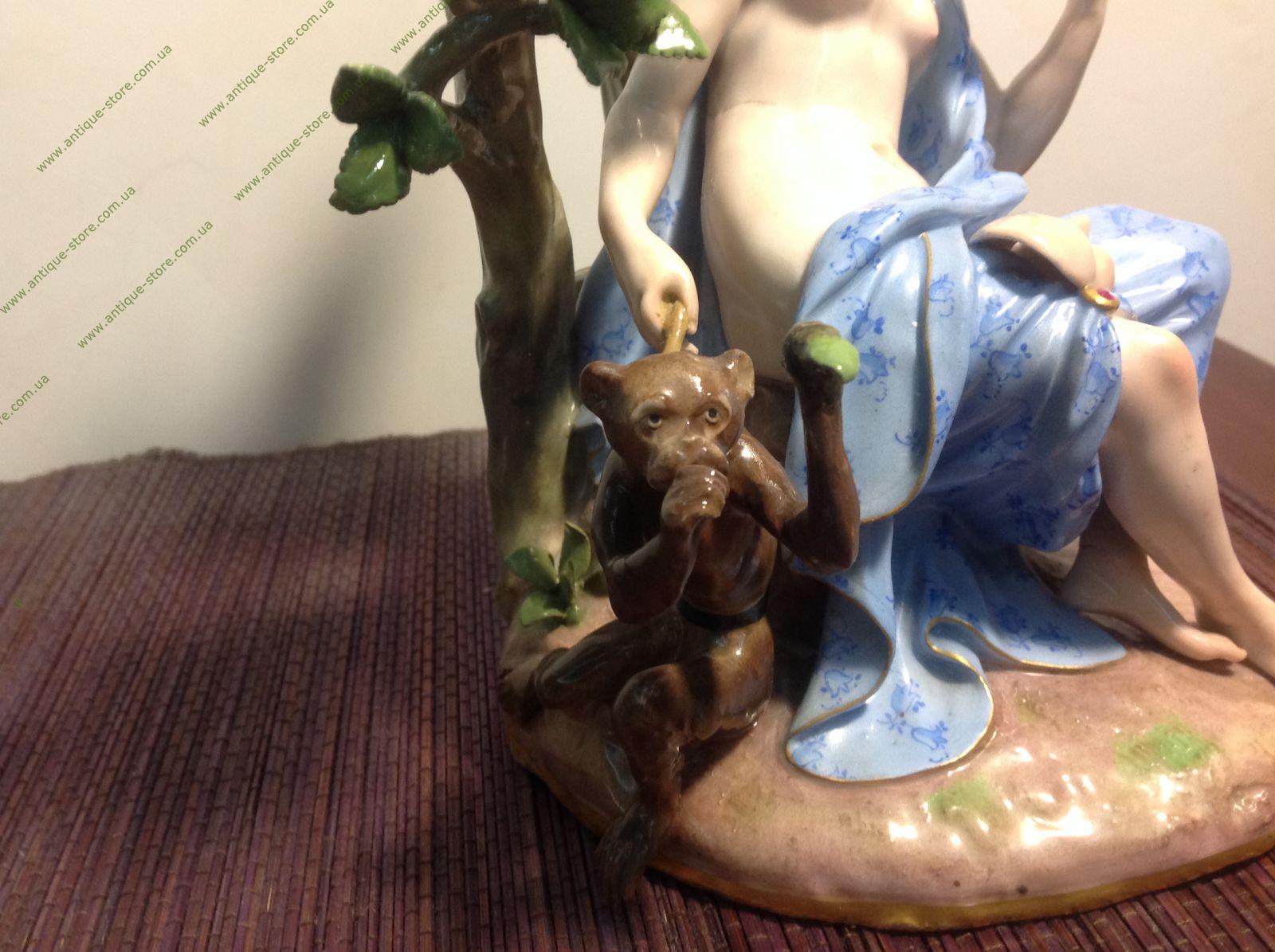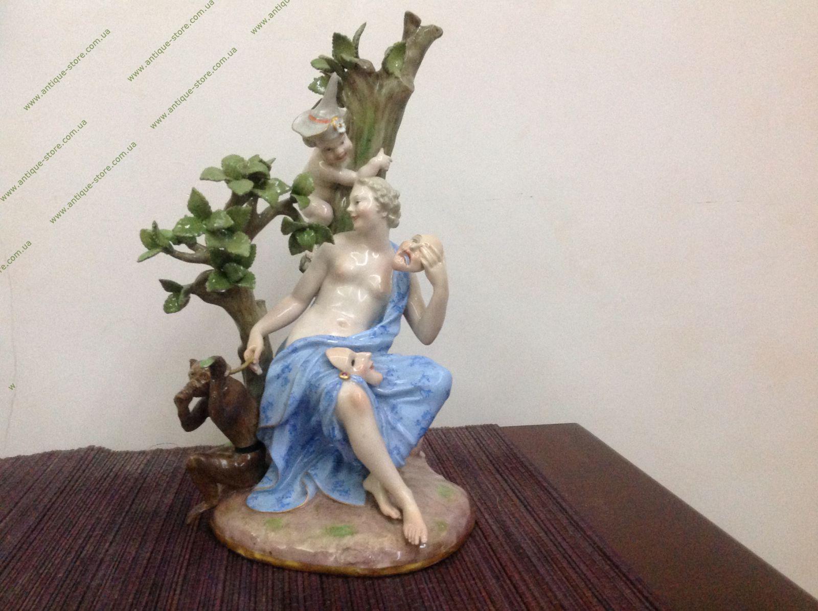 Фарфор, полихромная роспись, золочение, лепка. Марка: синим подглазурно "скрещенные мечи" и оттиск номера 625. Германия, Мейсенская фарфоровая мануфактура.Статуэтка выполнена по модели И.Кендлера. Скульптурная композиция включает в себя две фигурки: фигурку музы с обезьянкой и фигурку путти. Вся группа расположена на овальном основании.