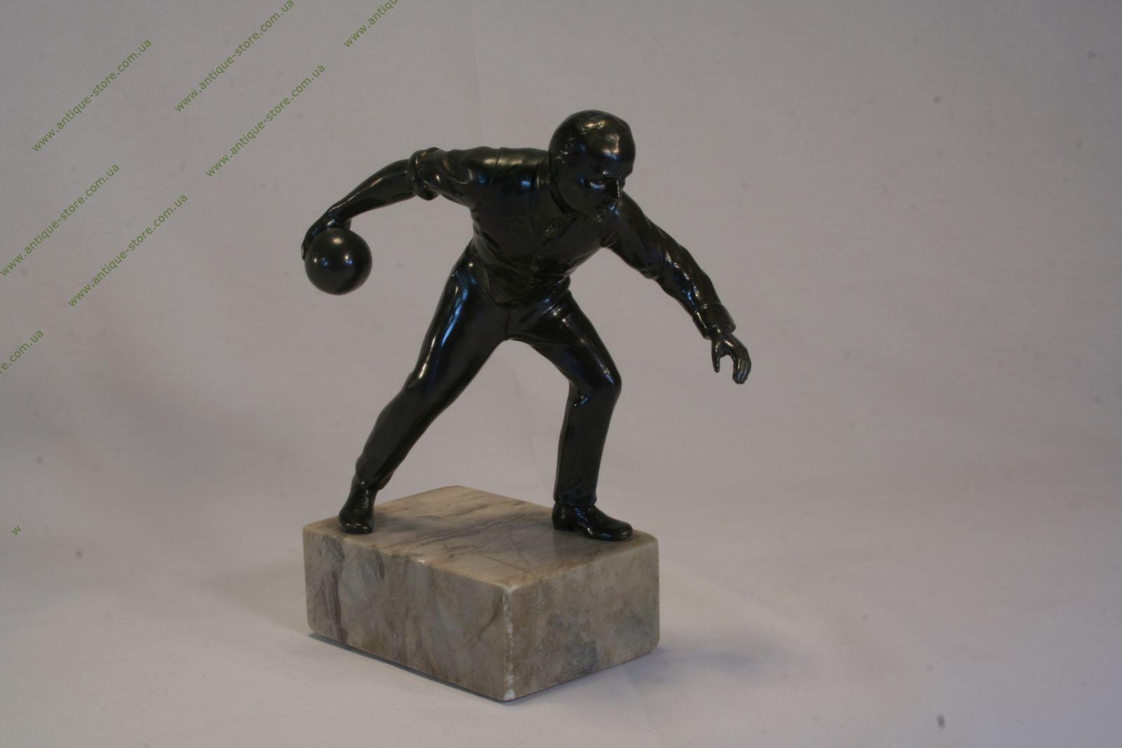 Фигура из 40-х годов, детальное изображение игрока в боулинг на массивном мраморном цоколе.