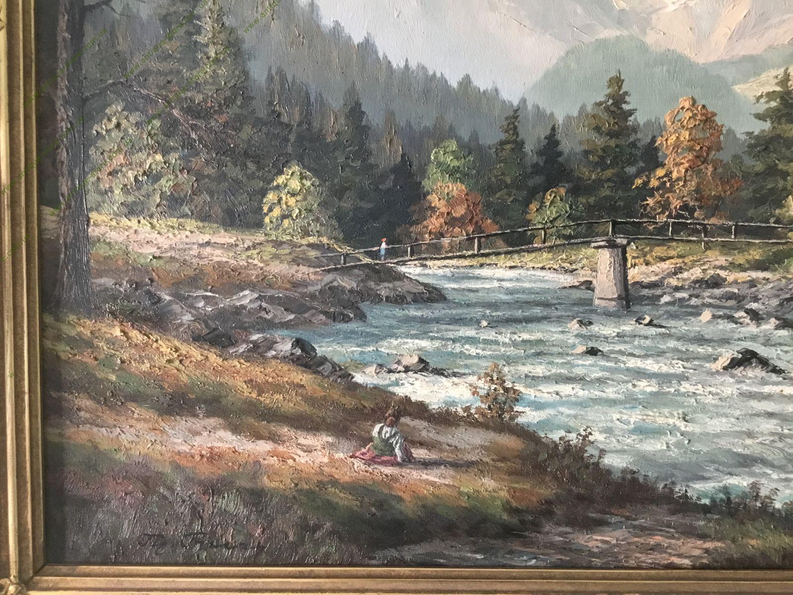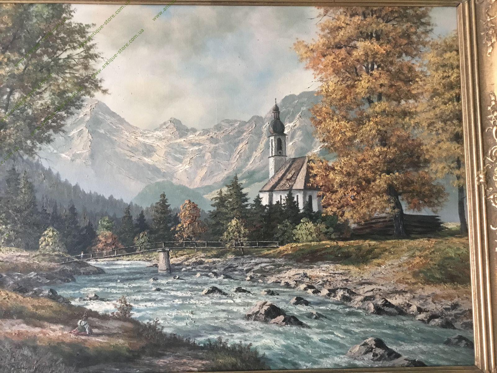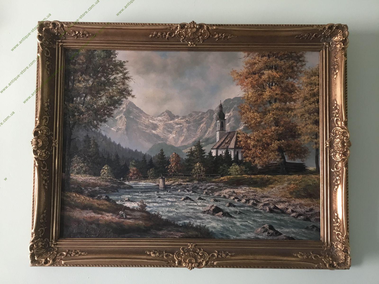 Картина, изображающая альпийский пейзаж с горами и домом. Пейзаж в романтическом стиле. В багетной раме.