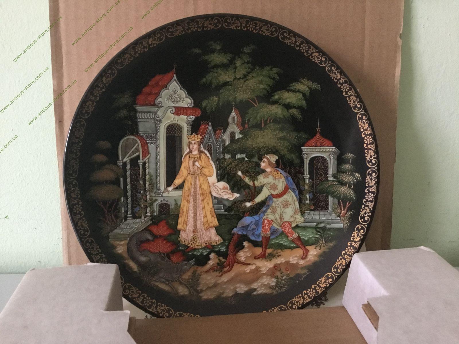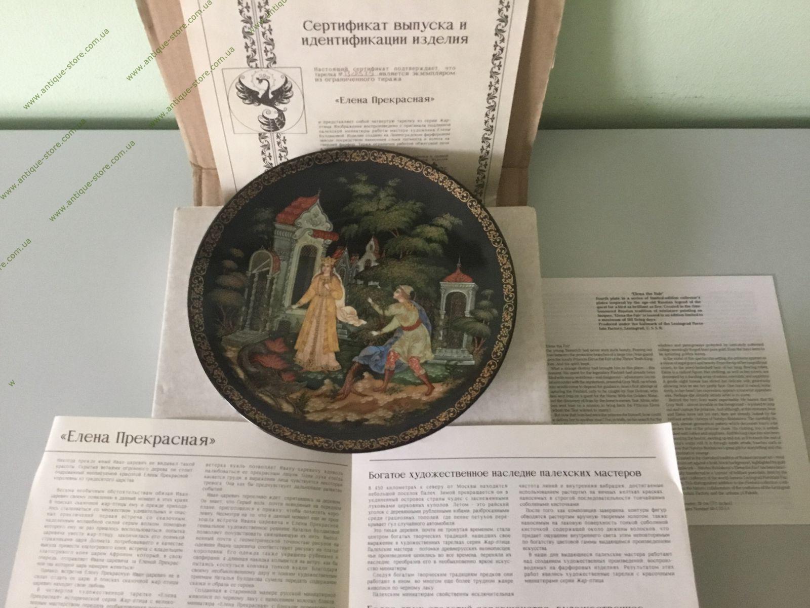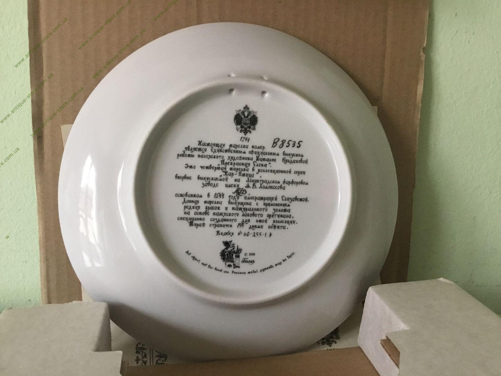 Коллекционная номерная тарелка «Елена Прекрасная». Фарфор, деколь. Диаметр 20,0 см. На обороте надпись. Работа палехской художницы Натальи Булдаковой. Тарелка из коллекционной серии «Жар-птица», номер В 8535. С сертификатом и в оригинальной упаковке. Ленинградский фарфоровый завод им. М.В. Ломоносова.