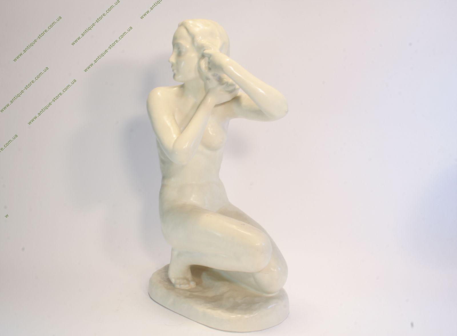 Обнаженная девушка, сидящая на коленях, , и причесывающая волосы. Прекрасный подарок. Работа времен Третьего Рейха.