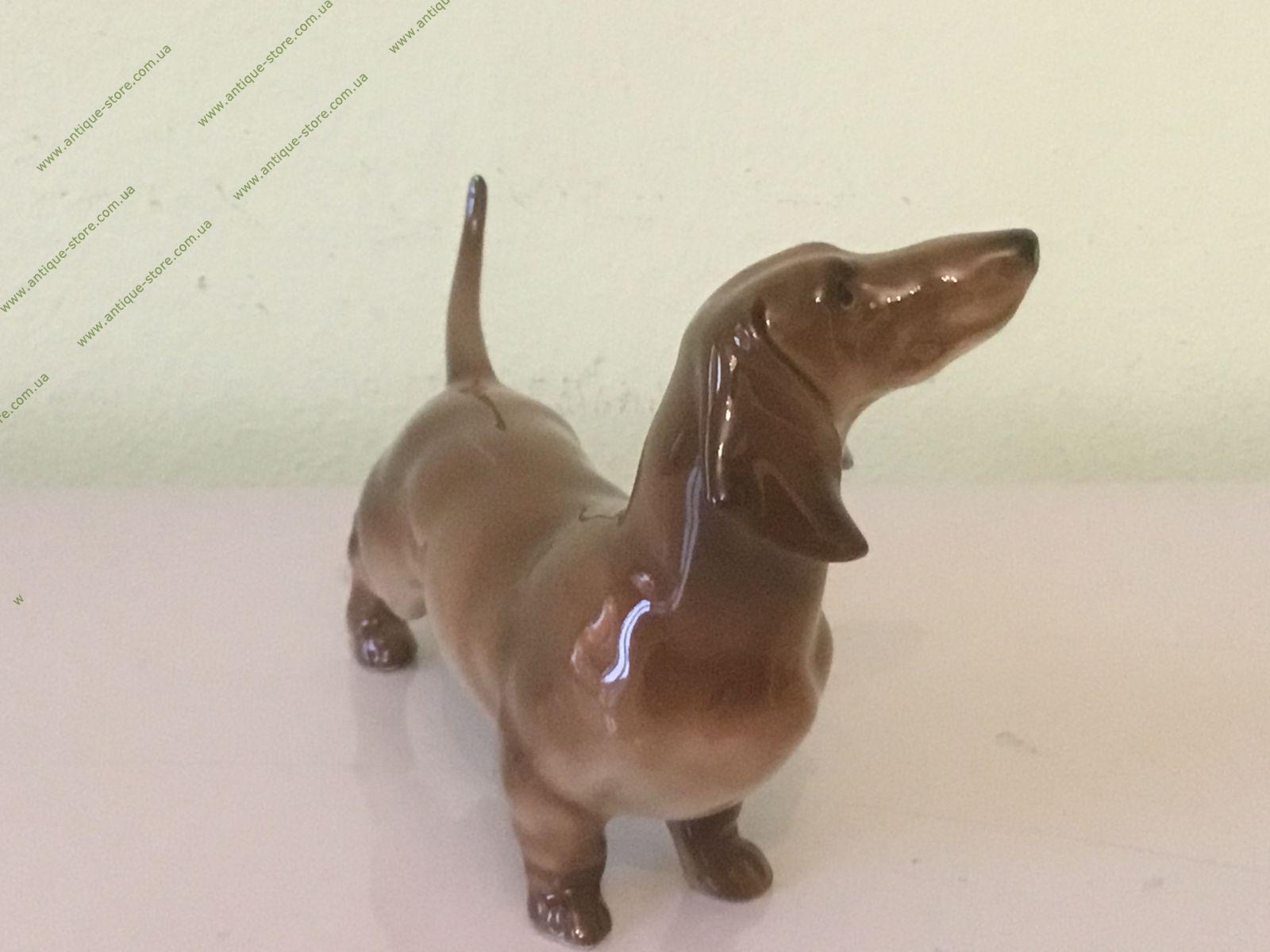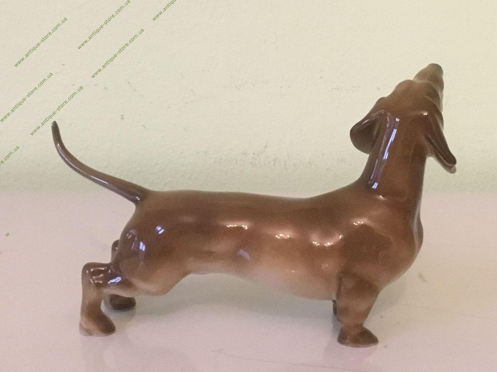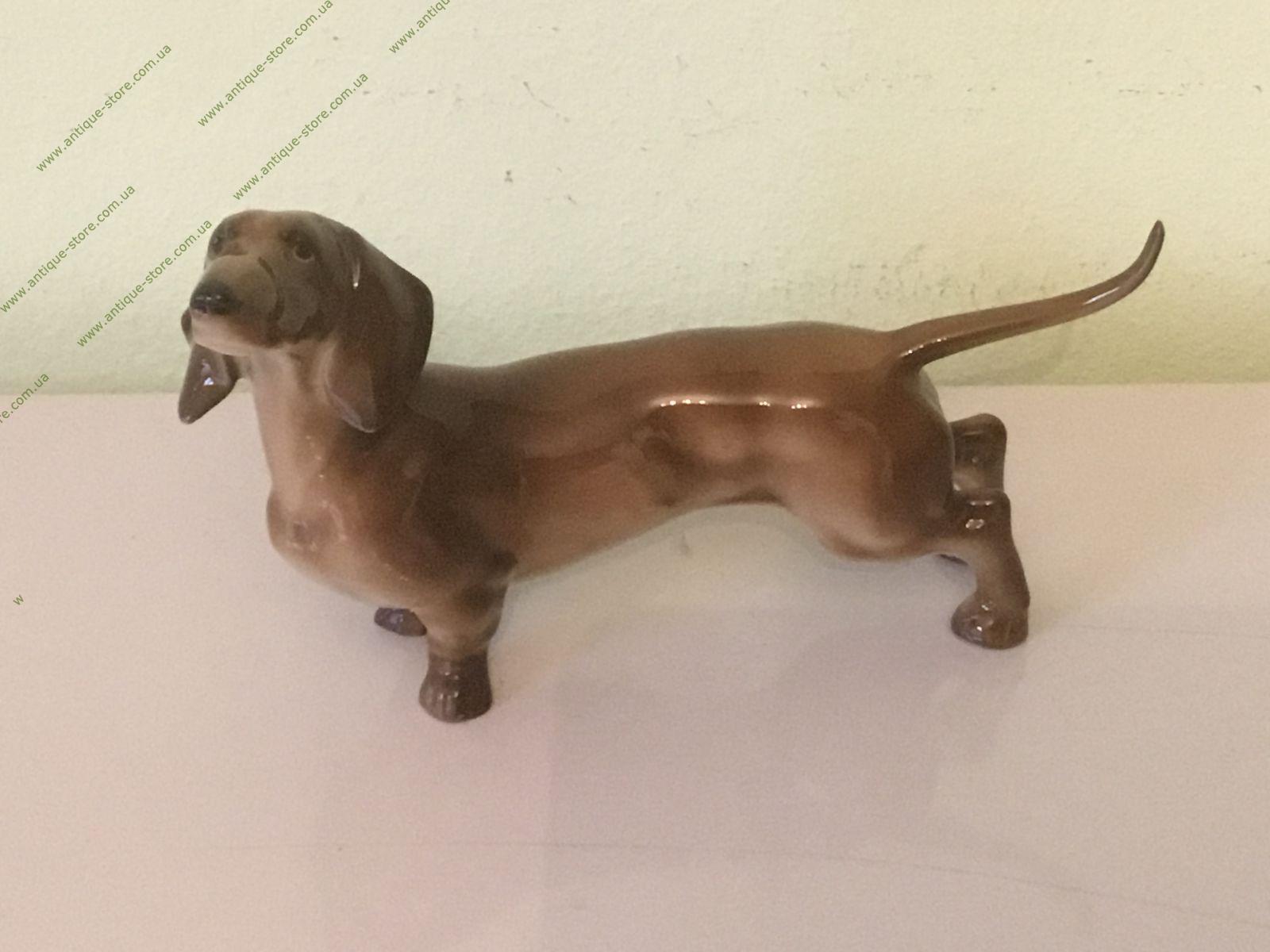 Фарфоровая фигурка, стоящей таксы с подглазурным клеймом мануфактуры Хутченройтер (Hutschenreuther) на обратной стороне.